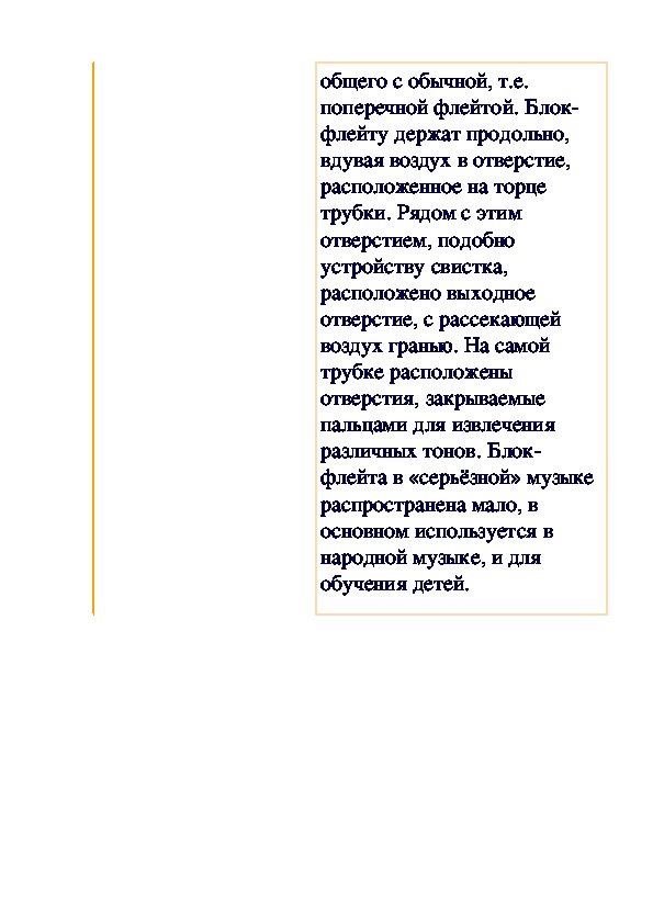 Блок-флейта, блокфлейта (продольная флейта) - духовой инструмент, как правило, сделан из дерева или пластика. Имеет очень мало общего с обычной, т.е. поперечной флейтой. Блок-флейту держат продольно, вдувая воздух в отверстие, расположенное на торце трубки. Рядом с этим отверстием, подобно устройству свистка, расположено выходное отверстие, с рассекающей воздух гранью. На самой трубке расположены отверстия, закрываемые пальцами для извлечения различных тонов. Блок-флейта в «серьёзной» музыке распространена мало, в основном используется в народной музыке, и для обучения детей.
