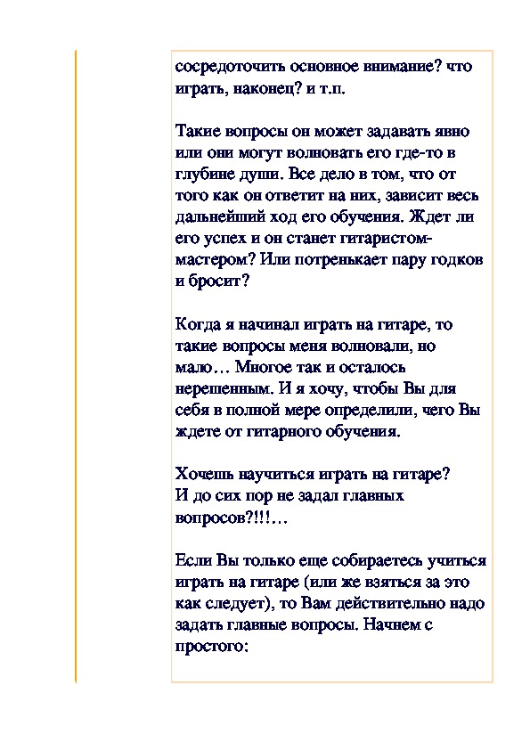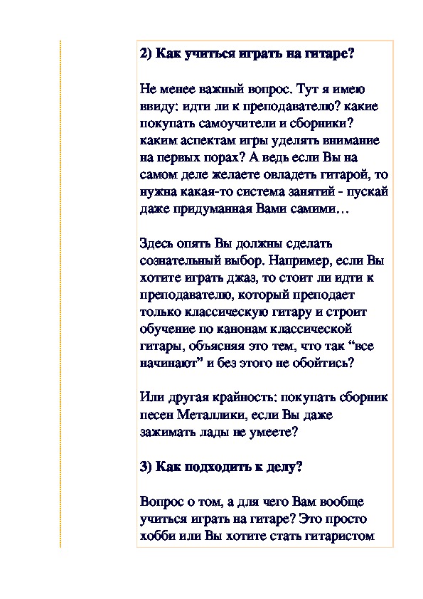 Когда я начинал играть на гитаре, то такие вопросы меня волновали, но мало… Многое так и осталось нерешенным. И я хочу, чтобы Вы для себя в полной мере определили, чего Вы ждете от гитарного обучения.