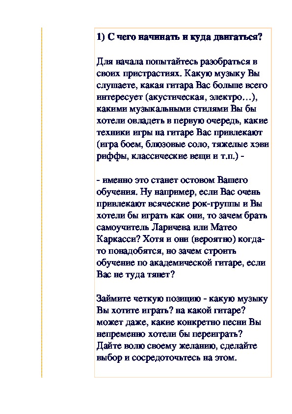 Известно, что каждый начинающий гитарист в начале своего обучения находится на своеобразной развилке (перекрёстке). Перед ним встает ряд вопросов. Например, такие: как нужно учиться играть на гитаре? с чего начинать? в каком направлении двигаться? каким принципам следовать? как подходить к делу? на чем сосредоточить основное внимание? что играть, наконец? и т.п.
