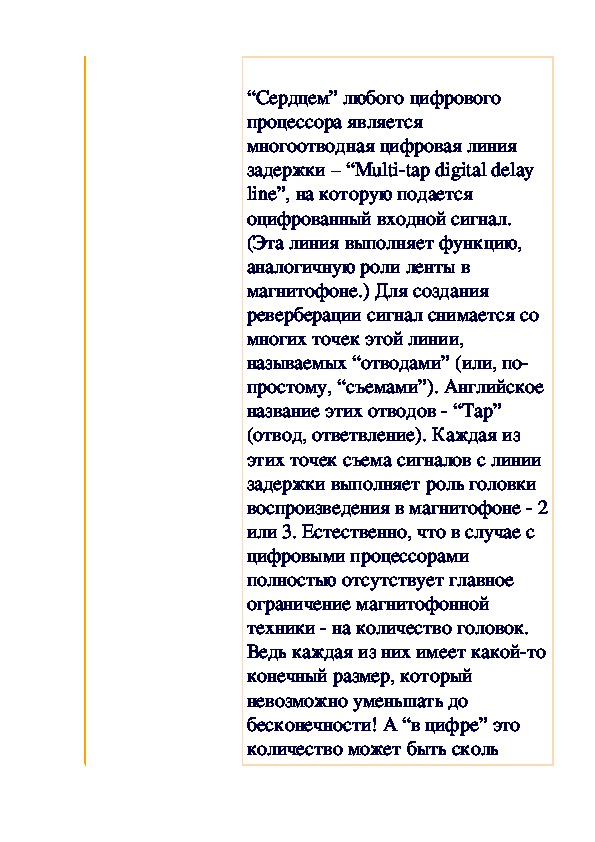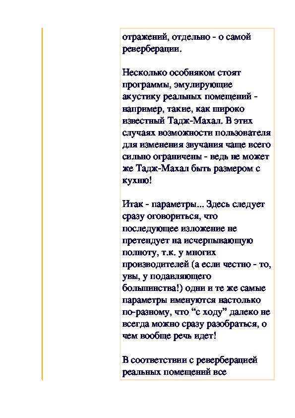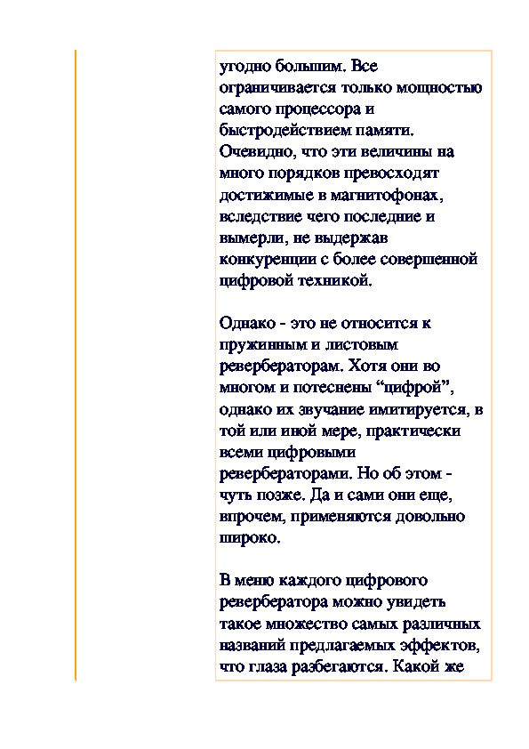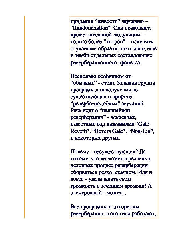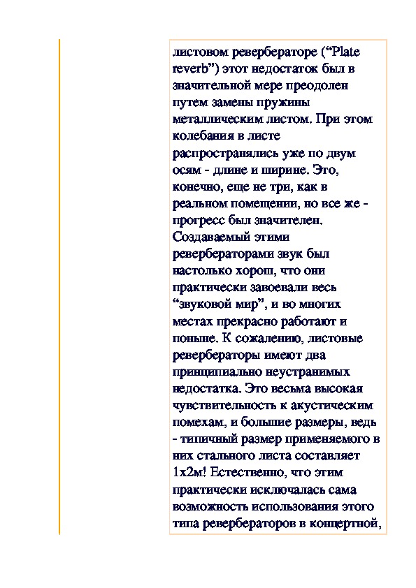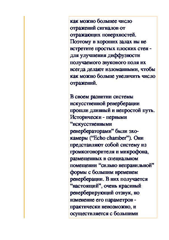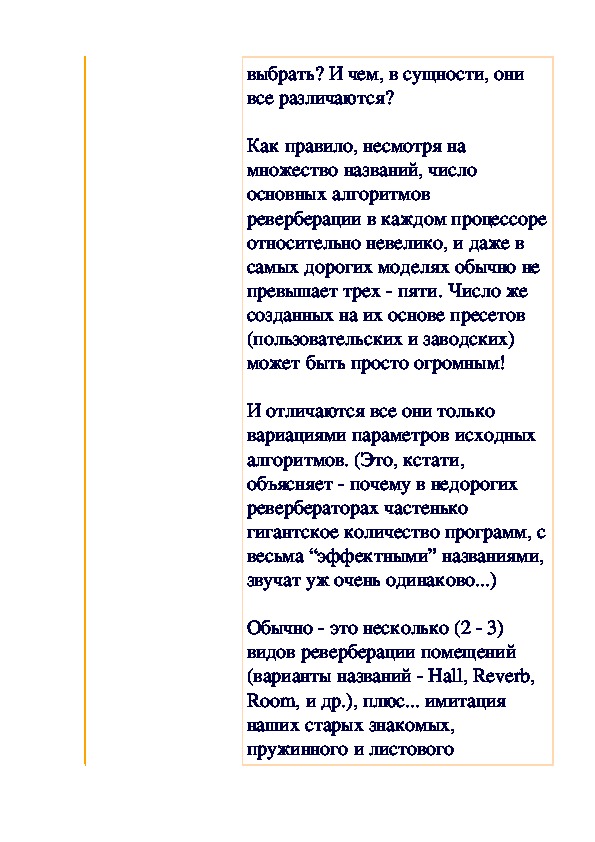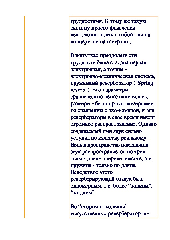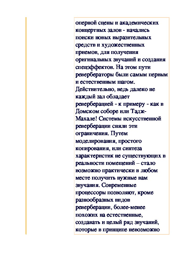 Процессоры пространственной обработки сигналов - чаще не совсем строго называемые просто ревербераторами - являются неотъемлемой частью любой современной студии и концертного зала. Своим появлением они обязаны повсеместному внедрению электроники - микрофонов, усилителей, и пр. - в практику звукозаписи и звукоусиления. Как только музыка вышла за пределы оперной сцены и академических концертных залов - начались поиски новых выразительных средств и художественных приемов, для получения оригинальных звучаний и создания спецэффектов. На этом пути ревербераторы были самым первым и естественным шагом. Действительно, ведь далеко не каждый зал обладает реверберацией - к примеру - как в Домском соборе или Тадж-Махале! Системы искусственной реверберации сняли эти ограничения. Путем моделирования, простого копирования, или синтеза характеристик не существующих в реальности помещений – стало возможно практически в любом месте получить нужные вам звучания. Современные процессоры позволяют, кроме разнообразных видов реверберации, более-менее похожих на естественные, создавать и целый ряд звучаний, которые в принципе невозможно получить в естественных условиях, но без которых палитра выразительных средств современной музыки стала бы сильно обедневшей - таких, как GATE REVERB, INVERS REVERB, и некоторых других.