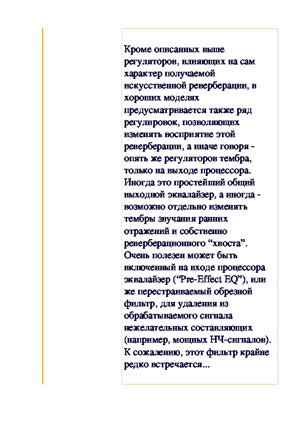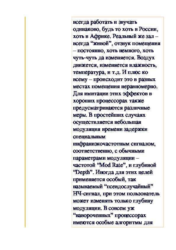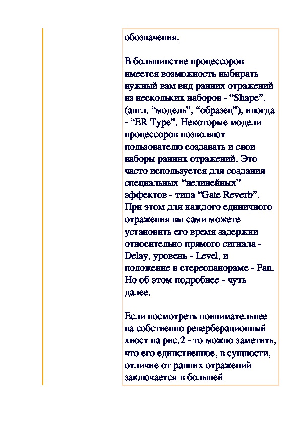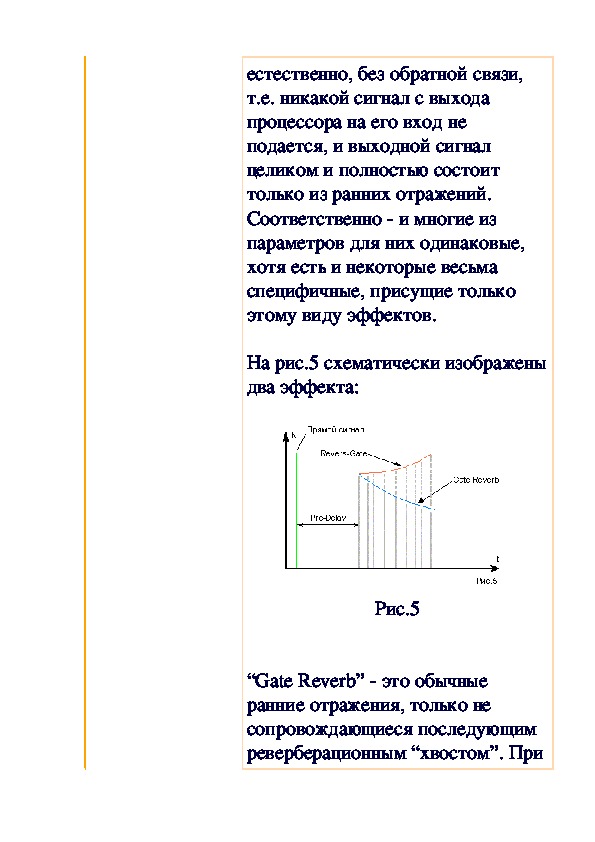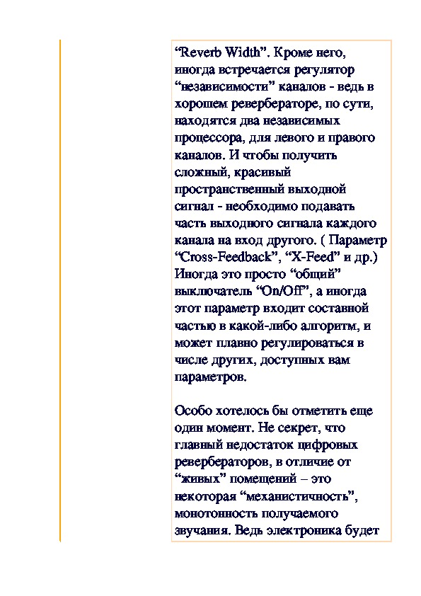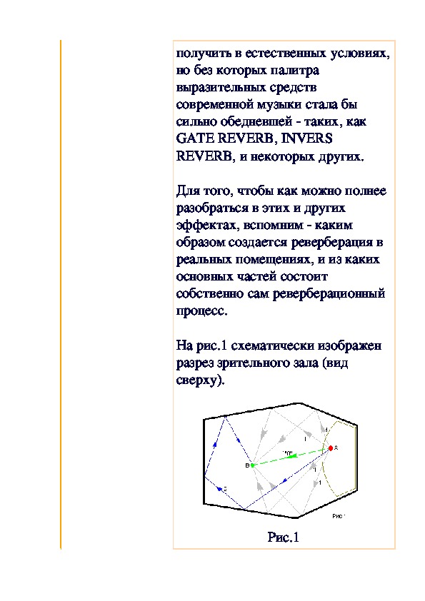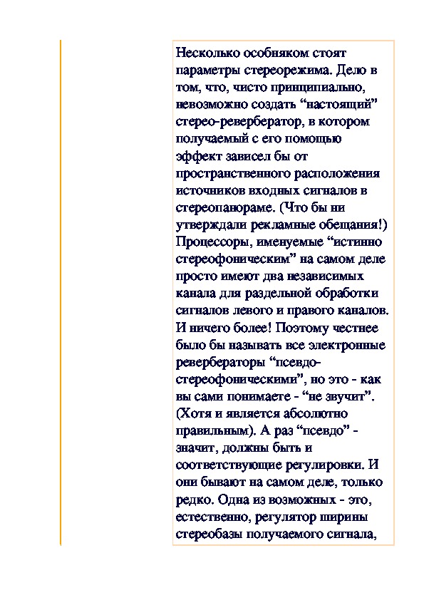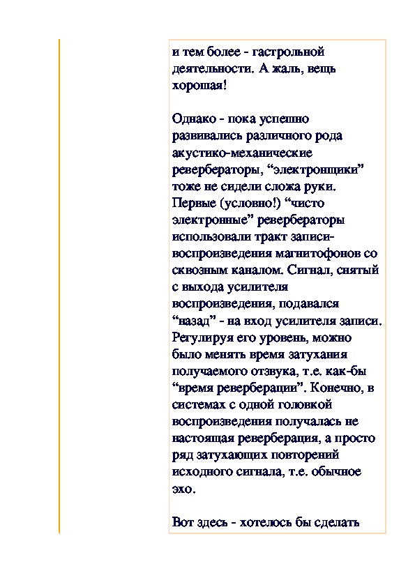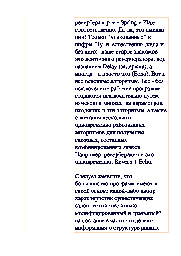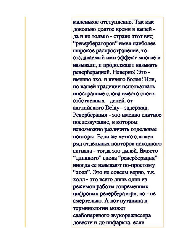 Процессоры пространственной обработки сигналов - чаще не совсем строго называемые просто ревербераторами - являются неотъемлемой частью любой современной студии и концертного зала. Своим появлением они обязаны повсеместному внедрению электроники - микрофонов, усилителей, и пр. - в практику звукозаписи и звукоусиления. Как только музыка вышла за пределы оперной сцены и академических концертных залов - начались поиски новых выразительных средств и художественных приемов, для получения оригинальных звучаний и создания спецэффектов. На этом пути ревербераторы были самым первым и естественным шагом. Действительно, ведь далеко не каждый зал обладает реверберацией - к примеру - как в Домском соборе или Тадж-Махале! Системы искусственной реверберации сняли эти ограничения. Путем моделирования, простого копирования, или синтеза характеристик не существующих в реальности помещений – стало возможно практически в любом месте получить нужные вам звучания. Современные процессоры позволяют, кроме разнообразных видов реверберации, более-менее похожих на естественные, создавать и целый ряд звучаний, которые в принципе невозможно получить в естественных условиях, но без которых палитра выразительных средств современной музыки стала бы сильно обедневшей - таких, как GATE REVERB, INVERS REVERB, и некоторых других.