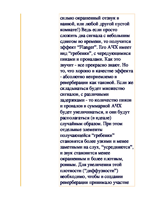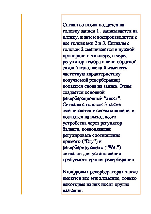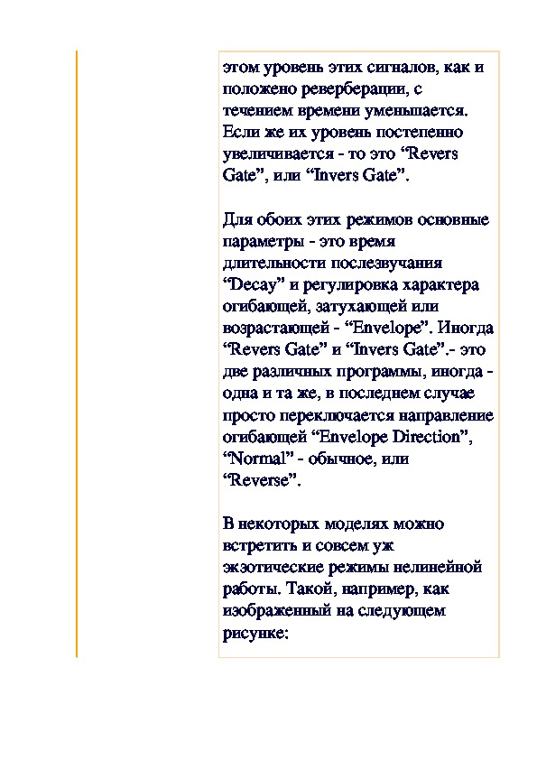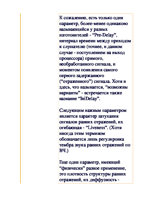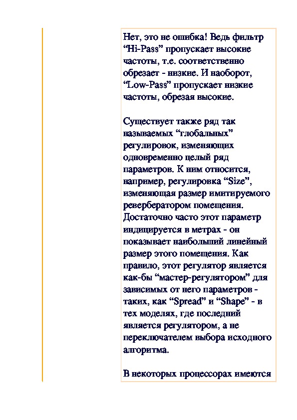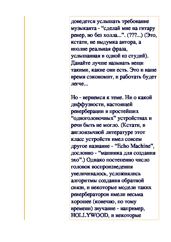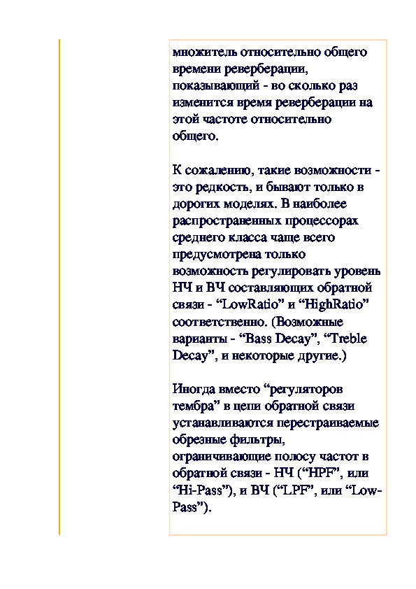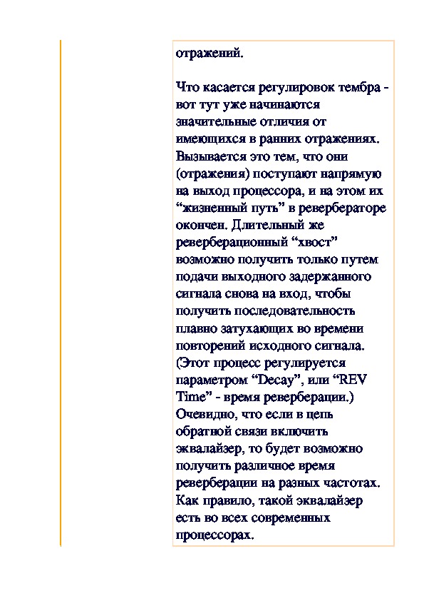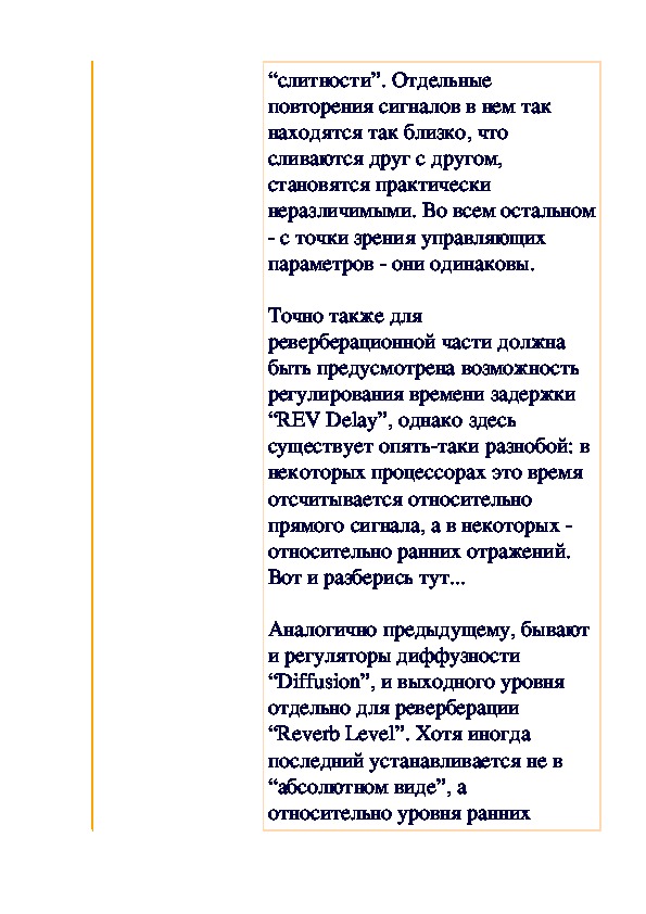 Процессоры пространственной обработки сигналов - чаще не совсем строго называемые просто ревербераторами - являются неотъемлемой частью любой современной студии и концертного зала. Своим появлением они обязаны повсеместному внедрению электроники - микрофонов, усилителей, и пр. - в практику звукозаписи и звукоусиления. Как только музыка вышла за пределы оперной сцены и академических концертных залов - начались поиски новых выразительных средств и художественных приемов, для получения оригинальных звучаний и создания спецэффектов. На этом пути ревербераторы были самым первым и естественным шагом. Действительно, ведь далеко не каждый зал обладает реверберацией - к примеру - как в Домском соборе или Тадж-Махале! Системы искусственной реверберации сняли эти ограничения. Путем моделирования, простого копирования, или синтеза характеристик не существующих в реальности помещений – стало возможно практически в любом месте получить нужные вам звучания. Современные процессоры позволяют, кроме разнообразных видов реверберации, более-менее похожих на естественные, создавать и целый ряд звучаний, которые в принципе невозможно получить в естественных условиях, но без которых палитра выразительных средств современной музыки стала бы сильно обедневшей - таких, как GATE REVERB, INVERS REVERB, и некоторых других.