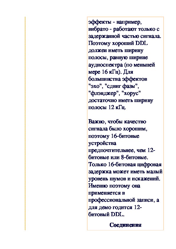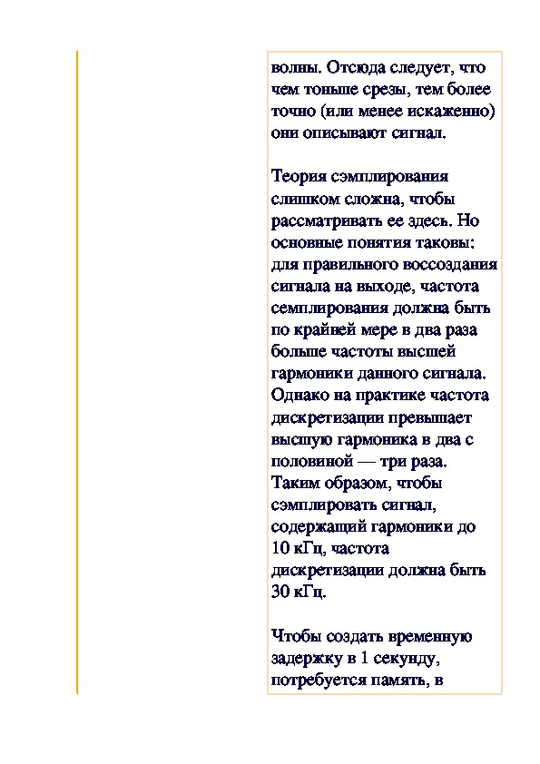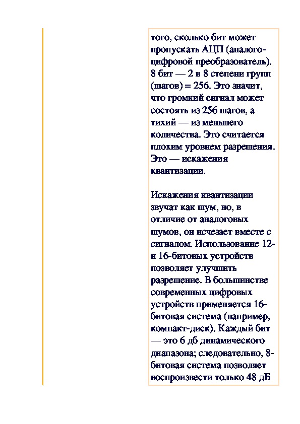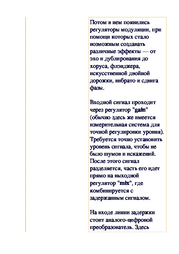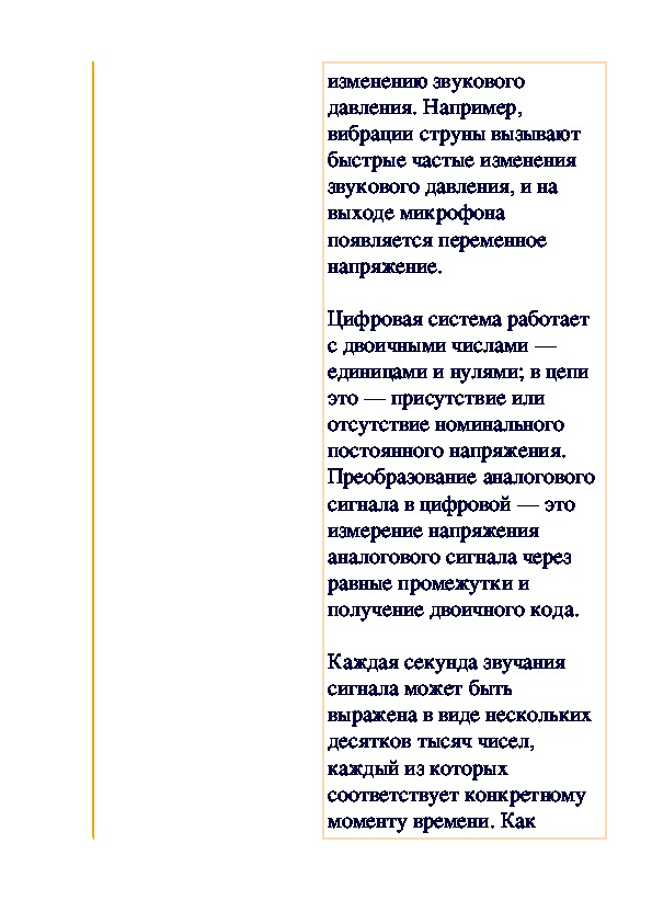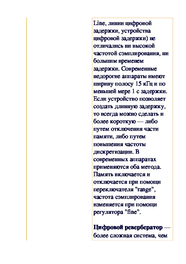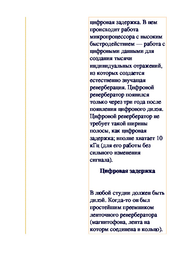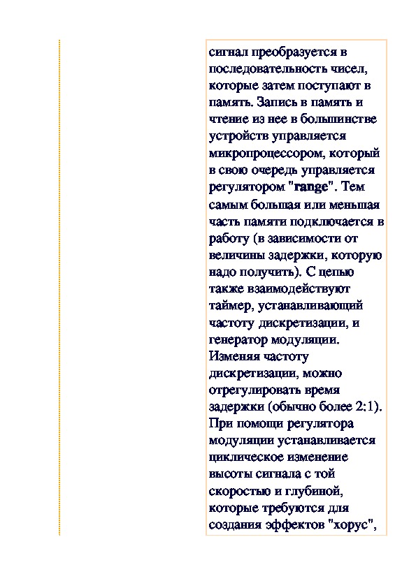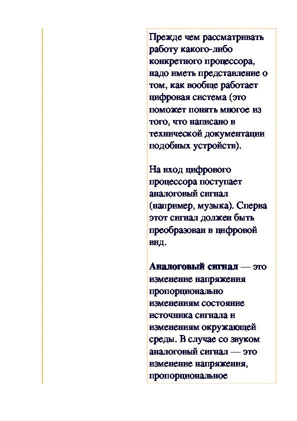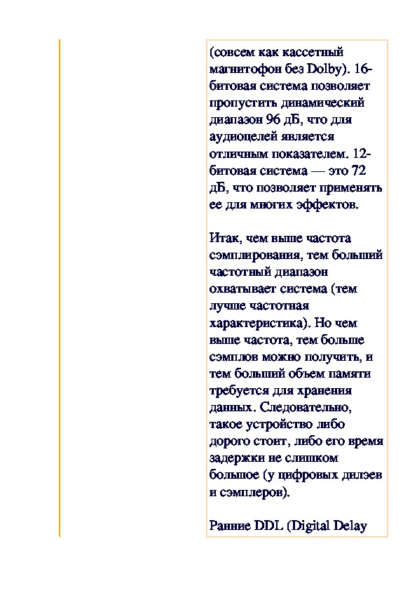 Большинство компрессоров и гейтов устроены на основе аналоговых цепей. Большая часть всех эффектов, которые применяют изменение времени в любой форме, основаны на цифровой электронике: дилэи, ревербераторы, pitch shifters (устройства сдвига высоты сигнала), процессоры мультиэффектов и т.д. Прежде чем рассматривать работу какого-либо конкретного процессора, надо иметь представление о том, как вообще работает цифровая система (это поможет понять многое из того, что написано в технической документации подобных устройств).