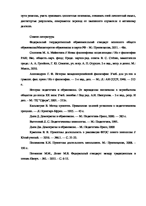 Поливанова К.Н. Проектная деятельность школьников. М.: Просвещение, 2008. –
