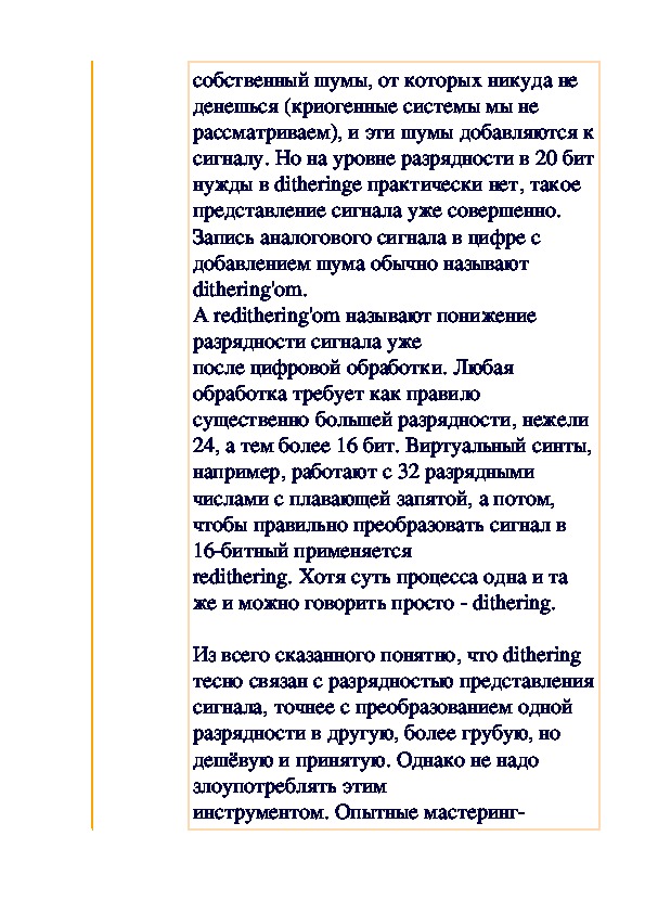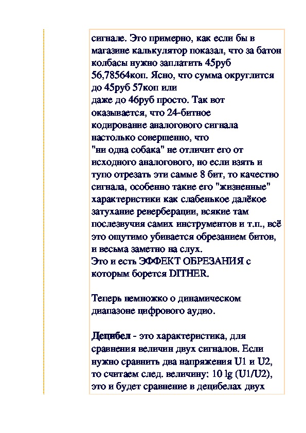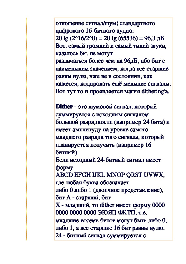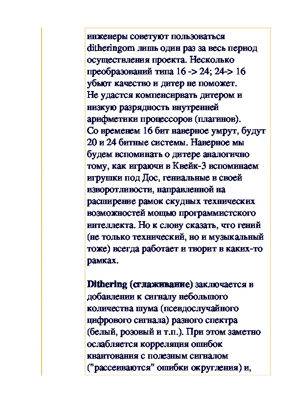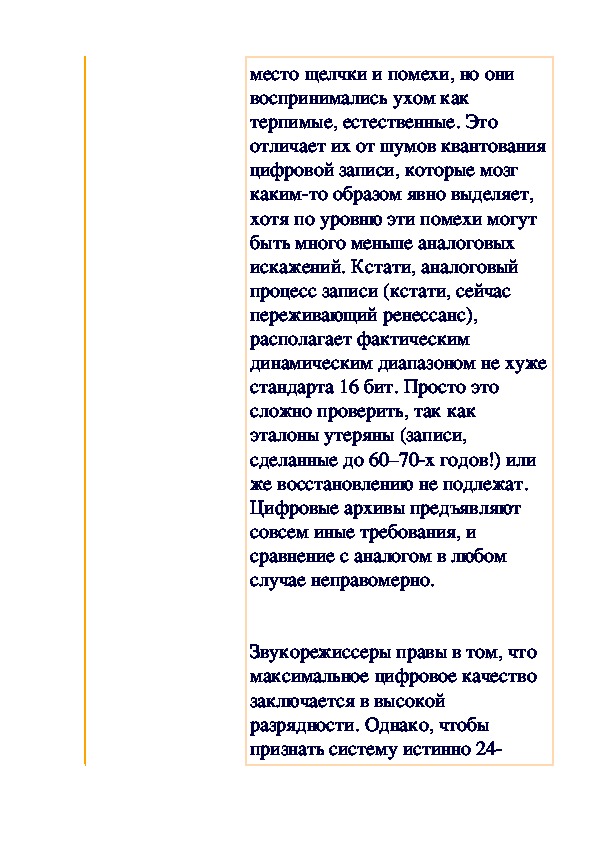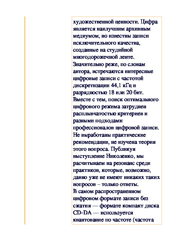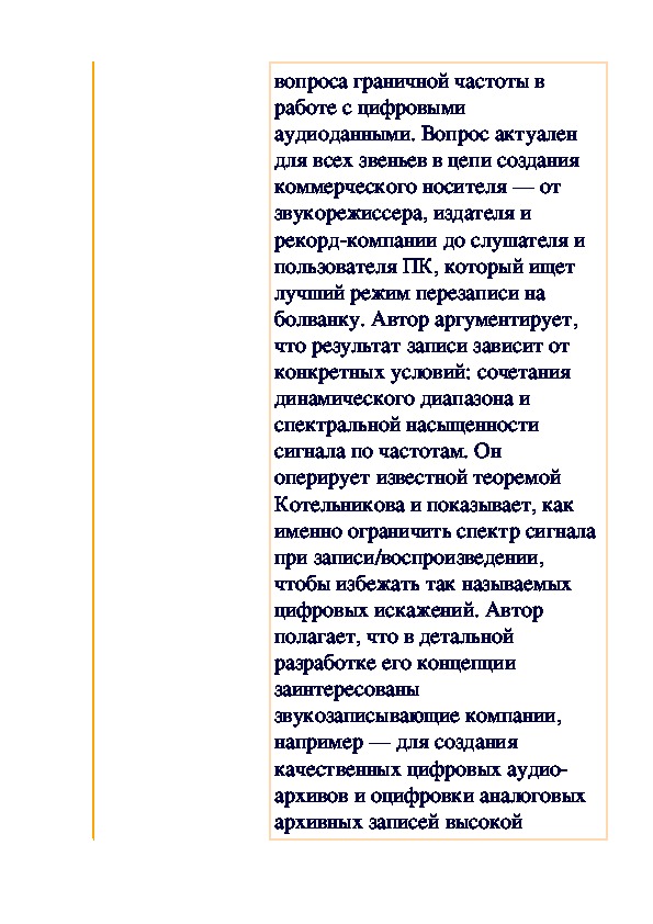 Как и обещали, мы публикуем статью по теории цифровой записи. Интересно, что автор статьи не мог удержаться и от чисто эстетических выкладок в этом плане. Предлагаемое выступление завсегдатая аудио-конференций Василия Николаенко и комментарий, одобренный автором, вращаются вокруг вопроса граничной частоты в работе с цифровыми аудиоданными. Вопрос актуален для всех звеньев в цепи создания коммерческого носителя — от звукорежиссера, издателя и рекорд-компании до слушателя и пользователя ПК, который ищет лучший режим перезаписи на болванку.