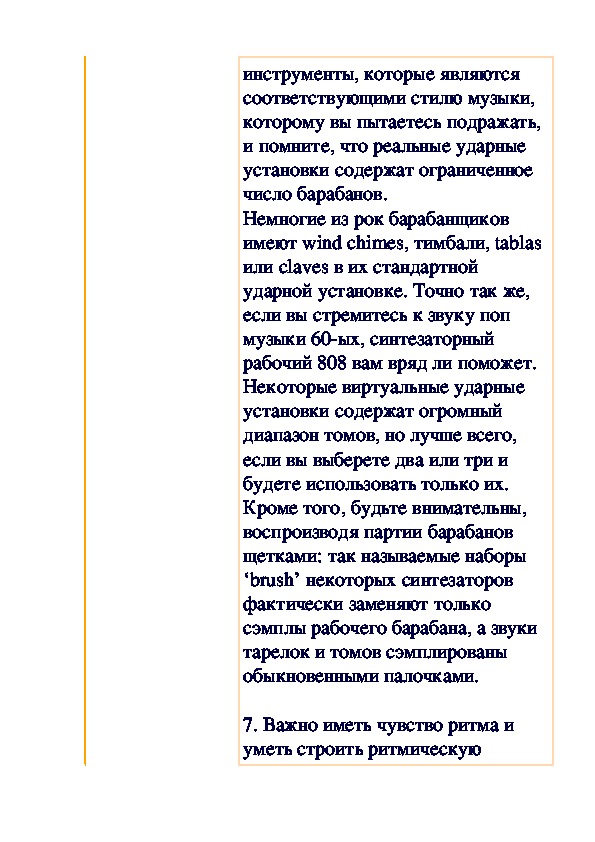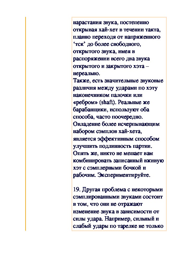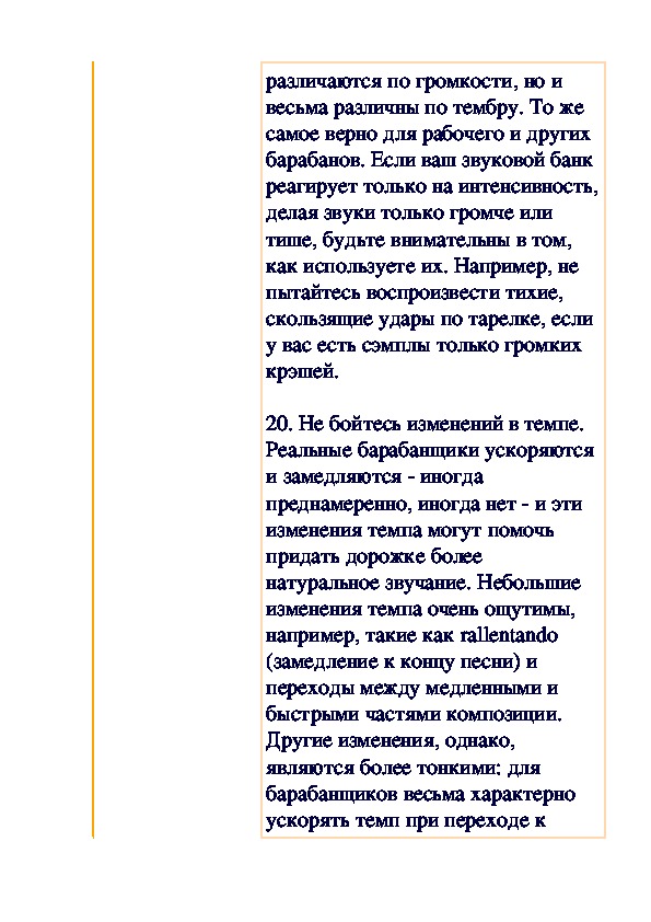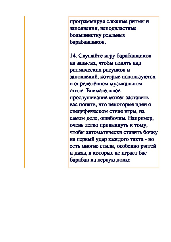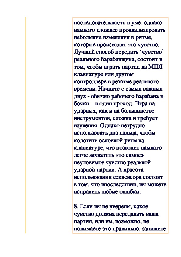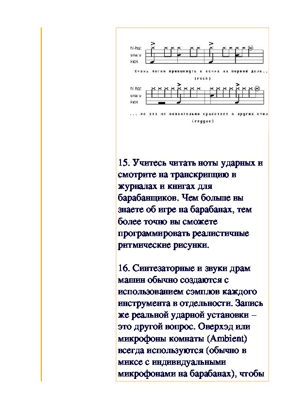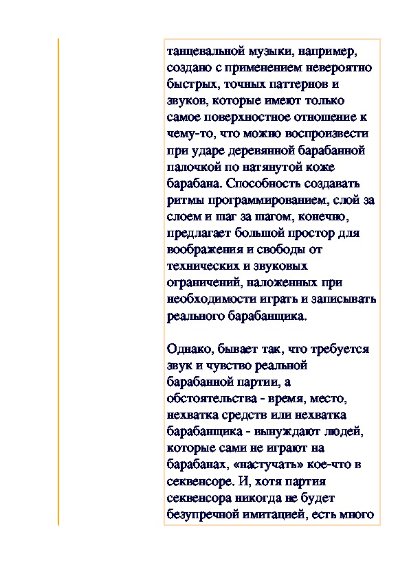 Многие могут справедливо утверждать, что большое преимущество сэмплированных, электронных барабанов состоит в том, что они не вынуждают вас использовать ‘реалистичные’ ритмические рисунки или звуки ударных. Большинство танцевальной музыки, например, создано с применением невероятно быстрых, точных паттернов и звуков, которые имеют только самое поверхностное отношение к чему-то, что можно воспроизвести при ударе деревянной барабанной палочкой по натянутой коже барабана. Способность создавать ритмы программированием, слой за слоем и шаг за шагом, конечно, предлагает большой простор для воображения и свободы от технических и звуковых ограничений, наложенных при необходимости играть и записывать реального барабанщика.