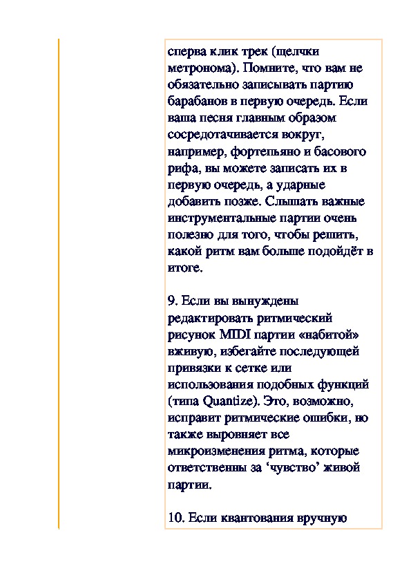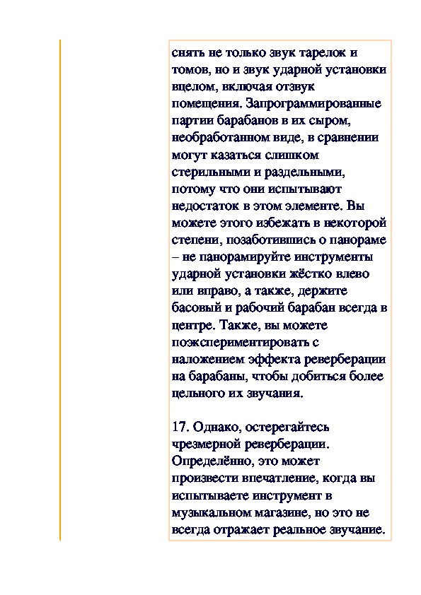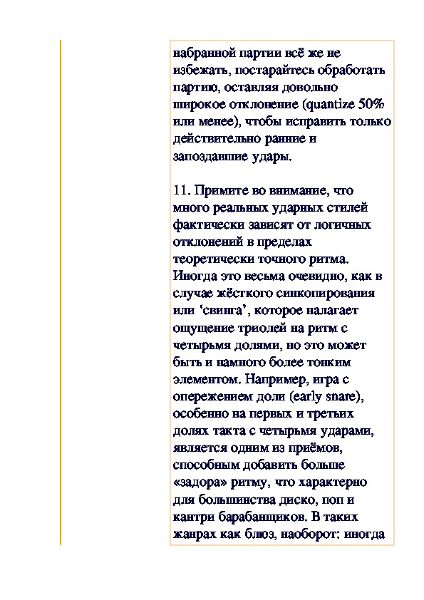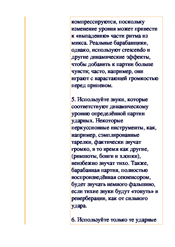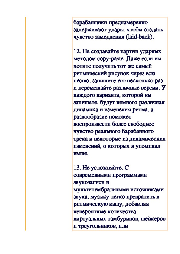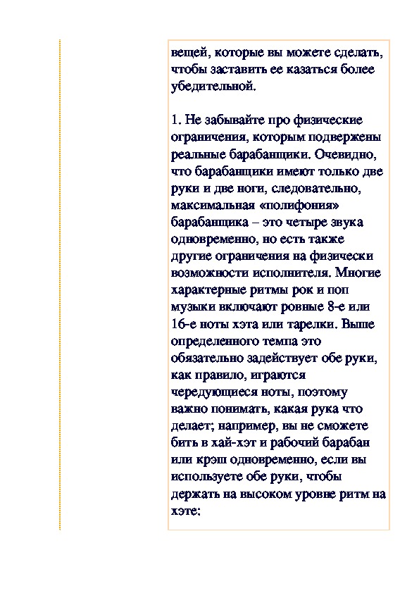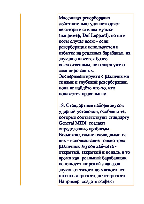 Многие могут справедливо утверждать, что большое преимущество сэмплированных, электронных барабанов состоит в том, что они не вынуждают вас использовать ‘реалистичные’ ритмические рисунки или звуки ударных. Большинство танцевальной музыки, например, создано с применением невероятно быстрых, точных паттернов и звуков, которые имеют только самое поверхностное отношение к чему-то, что можно воспроизвести при ударе деревянной барабанной палочкой по натянутой коже барабана. Способность создавать ритмы программированием, слой за слоем и шаг за шагом, конечно, предлагает большой простор для воображения и свободы от технических и звуковых ограничений, наложенных при необходимости играть и записывать реального барабанщика.