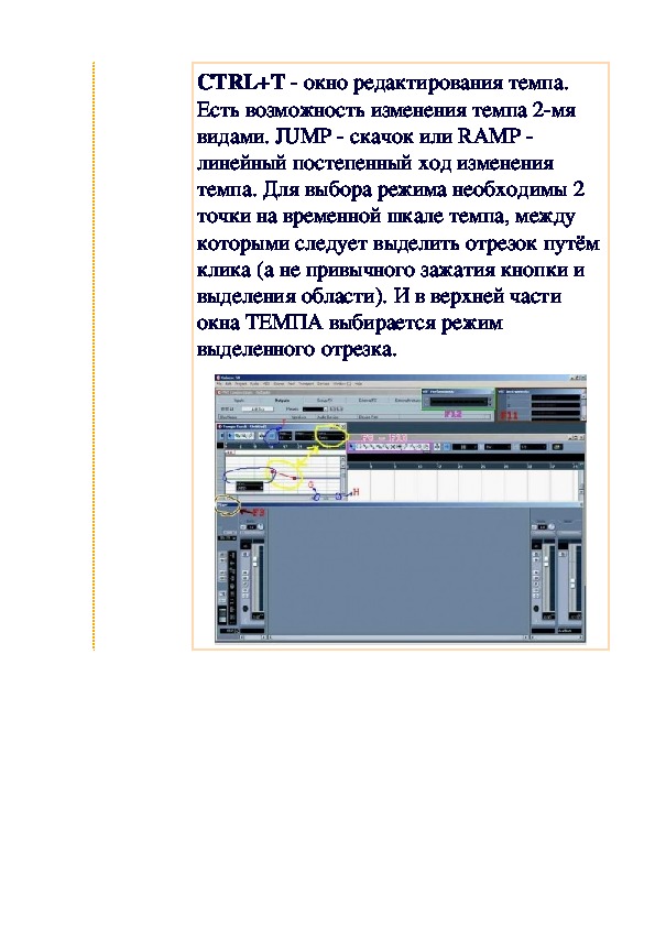 CTRL+T - окно редактирования темпа. Есть возможность изменения темпа 2-мя видами. JUMP - скачок или RAMP - линейный постепенный ход изменения темпа. Для выбора режима необходимы 2 точки на временной шкале темпа, между которыми следует выделить отрезок путём клика (а не привычного зажатия кнопки и выделения области). И в верхней части окна ТЕМПА выбирается режим выделенного отрезка.