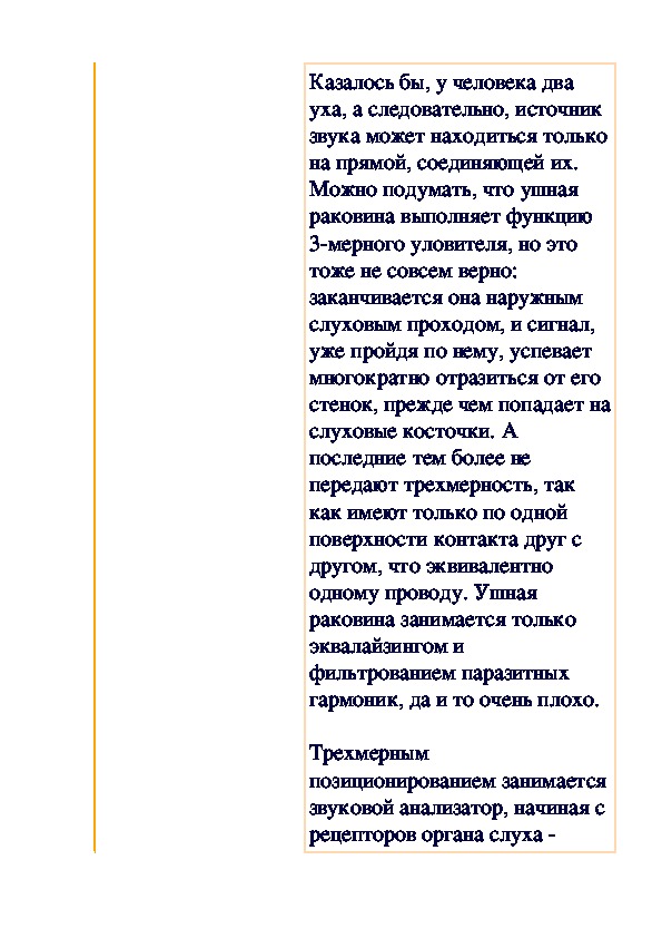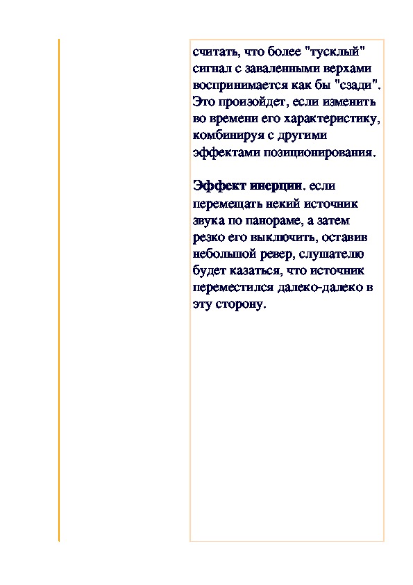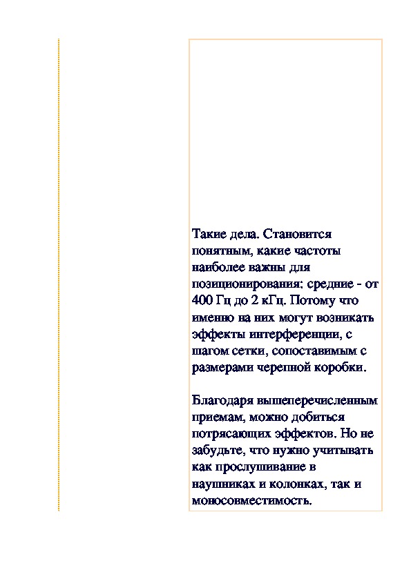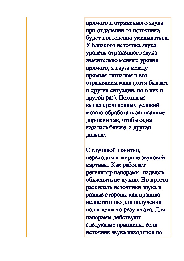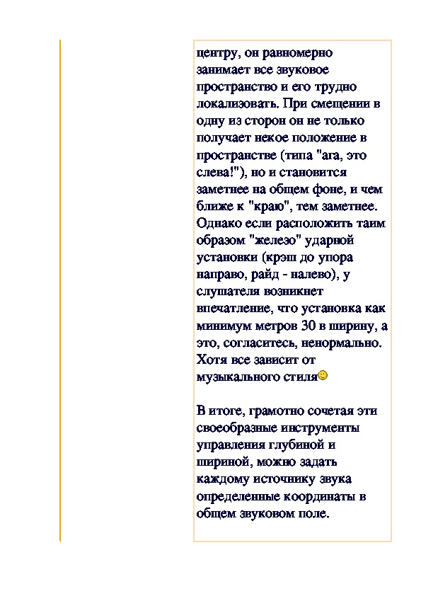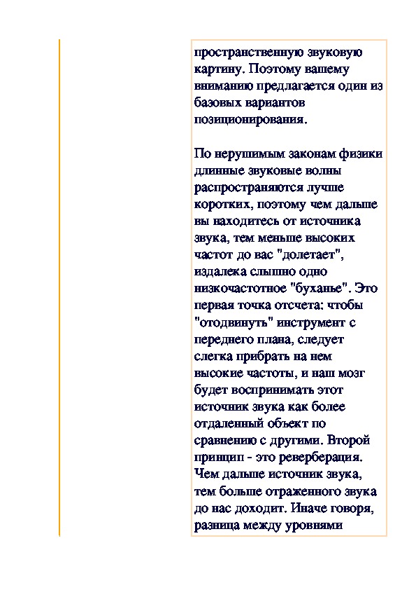 Как позиционировать инструменты в пространстве?. Что ж, вопрос по существу. Конечно, выпускаются всевозможные плагины, которые вроде как помещают источник звука (т.е. записанную дорожку) в нужную часть виртуальной комнаты. Однако это не единственный способ позиционирования инструментов, ведь в докомпьютерное время звукоинженерам как-то удавалось создавать пространственную звуковую картину. Поэтому вашему вниманию предлагается один из базовых вариантов позиционирования.