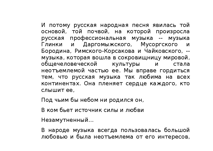 Волнующе прекрасна и неотразимо притягательна русская музыка. В ней -- наше славное прошлое и достойное настоящее, седая старина и животрепещущая современность. Потому эта музыка так много говорит сердцу, что сама заключает в себе душу породившего ее народа.