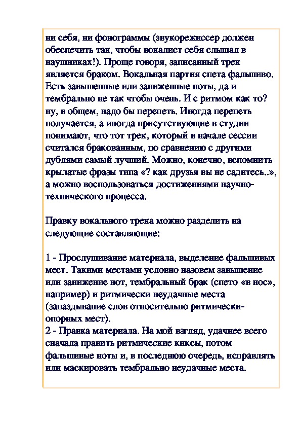 Ах если бы то, что записалось, звучало бы так же, как и в собственной голове. На практике это далеко не так. В ряде случаев полученный результат оставляет желать лучшего. Было замечено, что даже неплохие вокалисты, надевая студийные наушники, превращаются в токующих тетеревов, не слышащих ни себя, ни фонограммы (звукорежиссер должен обеспечить так, чтобы вокалист себя слышал в наушниках!).