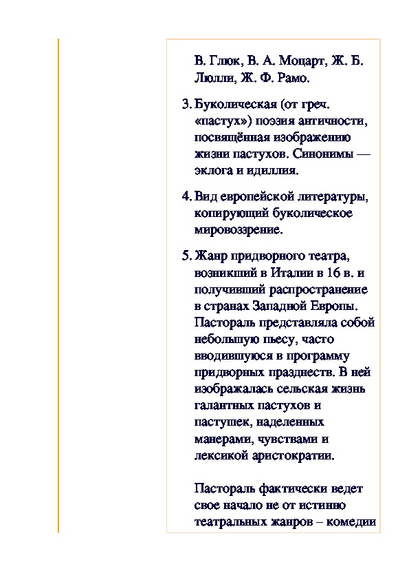 Жанр придворного театра, возникший в Италии в 16 в. и получивший распространение в странах Западной Европы. Пастораль представляла собой небольшую пьесу, часто вводившуюся в программу придворных празднеств. В ней изображалась сельская жизнь галантных пастухов и пастушек, наделенных манерами, чувствами и лексикой аристократии.