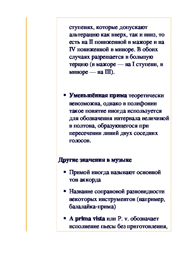 • Уменьшённая прима теоретически невозможна, однако в полифонии такое понятие иногда используется для обозначения интервала величиной в полтона, образующегося при пересечении линий двух соседних голосов.
