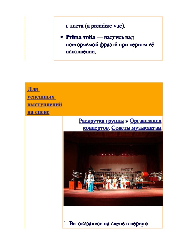 • A prima vista или Р. v. обозначает исполнение пьесы без приготовления, с листа (а premiere vue).