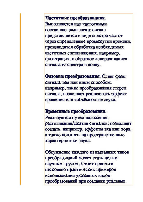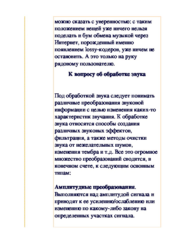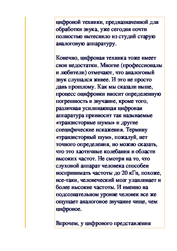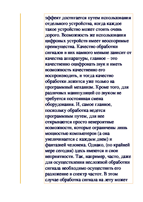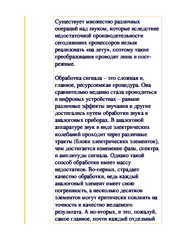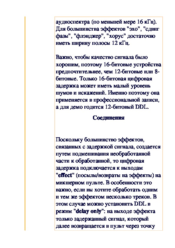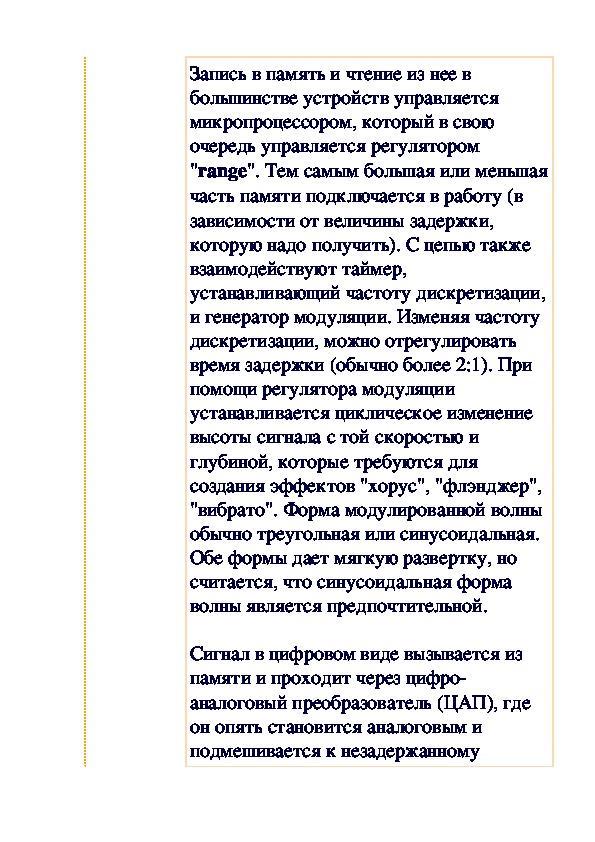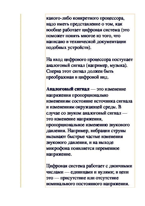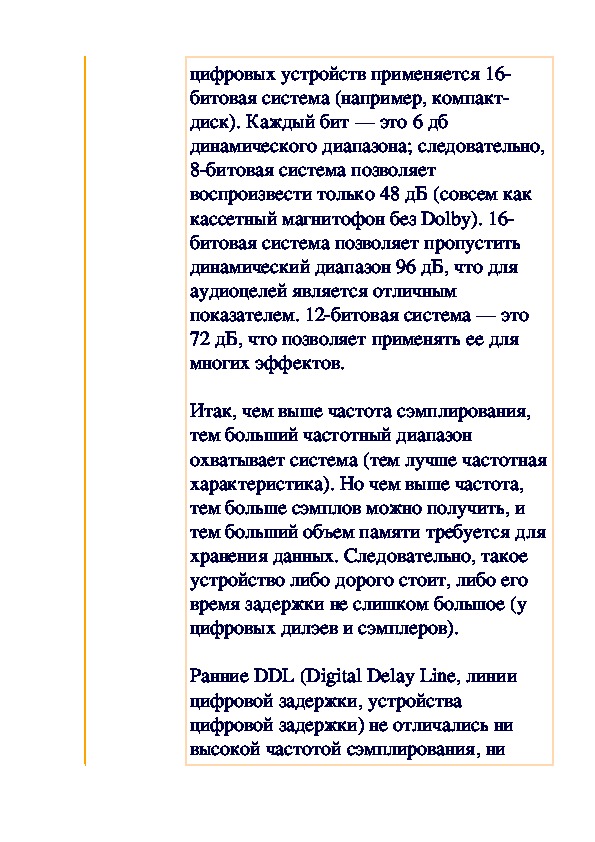 Большинство компрессоров и гейтов устроены на основе аналоговых цепей. Большая часть всех эффектов, которые применяют изменение времени в любой форме, основаны на цифровой электронике: дилэи, ревербераторы, pitch shifters (устройства сдвига высоты сигнала), процессоры мультиэффектов и т.д. Прежде чем рассматривать работу какого-либо конкретного процессора, надо иметь представление о том, как вообще работает цифровая система (это поможет понять многое из того, что написано в технической документации подобных устройств).