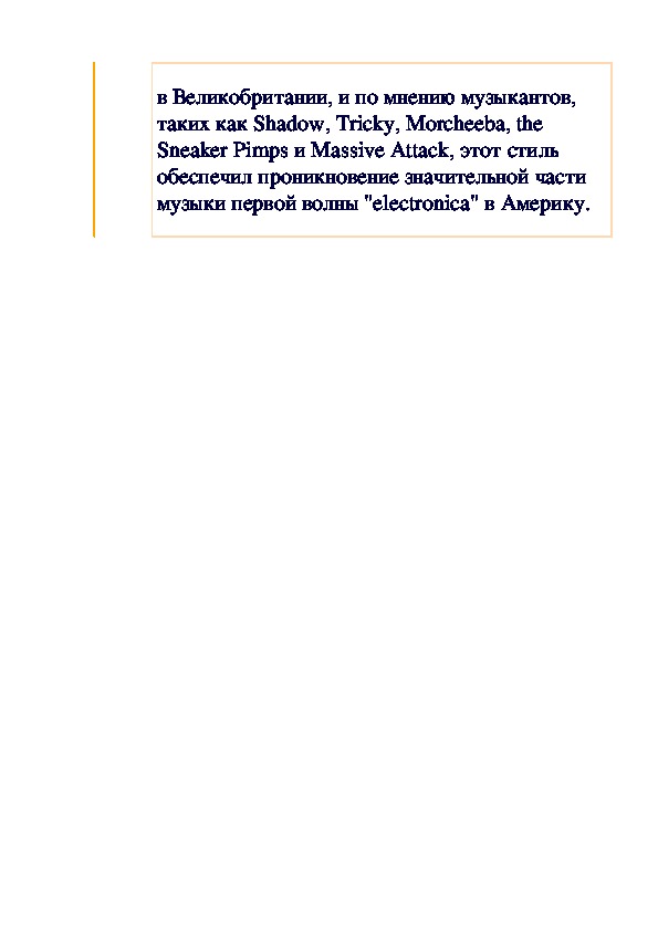 Одним из первых коммерчески значимых гибридом на базе танцевальной музыки, - полные версии альбомов в стиле trip-hop, стали постоянными лидерами альтернативных чартов в Великобритании, и по мнению музыкантов, таких как Shadow, Tricky, Morcheeba, the Sneaker Pimps и Massive Attack, этот стиль обеспечил проникновение значительной части музыки первой волны "electronica" в Америку.