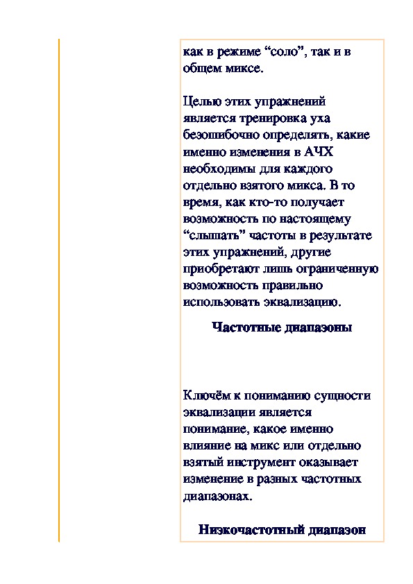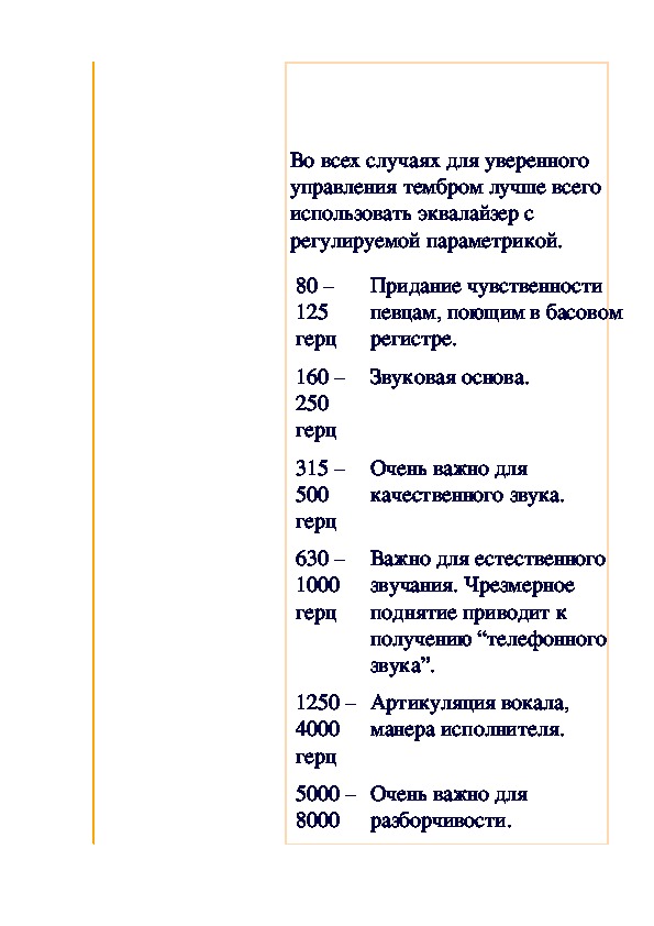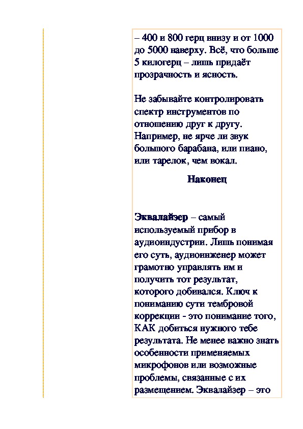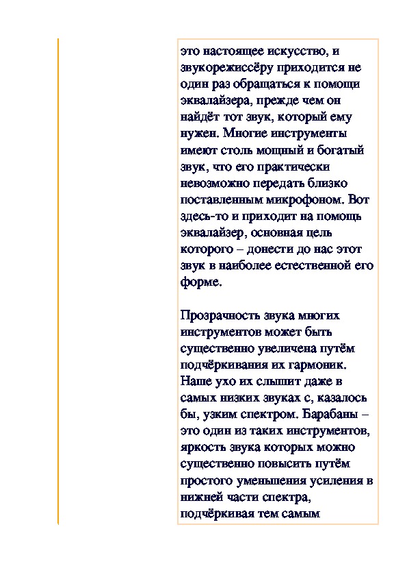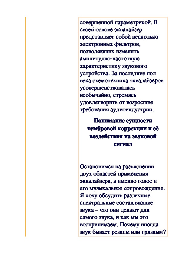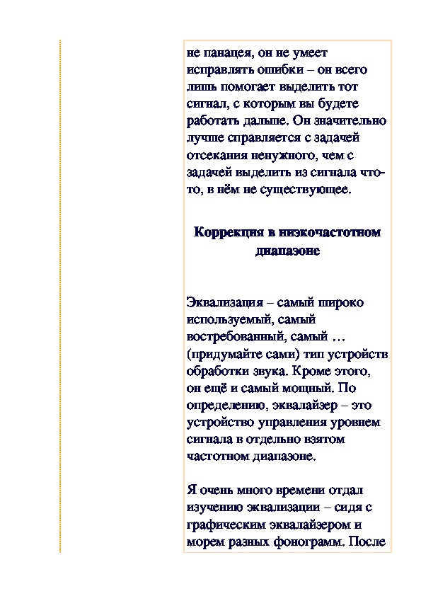 Рождённый в 30-х годах, эквалайзер является старейшей и наиболее часто используемой звукорежисёрами обработкой звука. Сегодня на рынке хватает самых разных приборов для тембровой коррекции – от простого НЧ-ВЧ корректора 50-х до навороченного многополосного эквалайзера с совершенной параметрикой. В своей основе эквалайзер представляет собой несколько электронных фильтров, позволяющих изменять амплитудно-частотную характеристику звукового устройства. За последние пол века схемотехника эквалайзеров усовершенствовалась необычайно, стремясь удовлетворить от возросшие требования аудиоиндустрии.