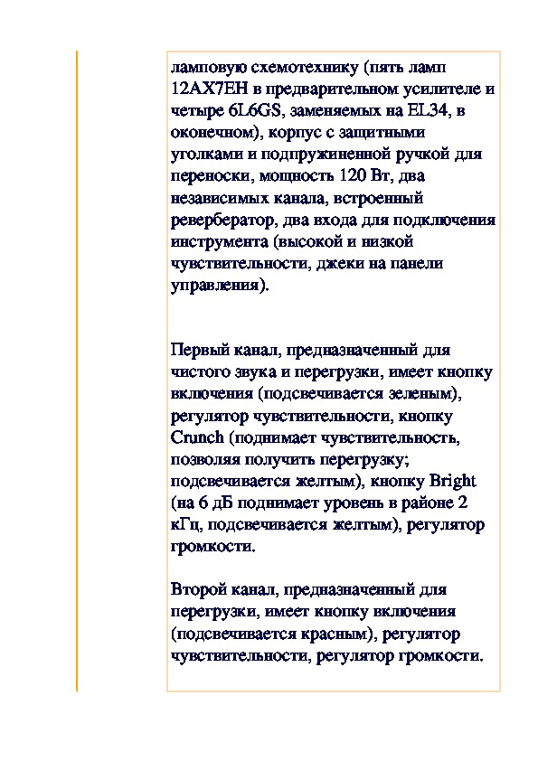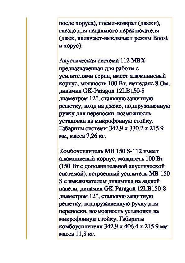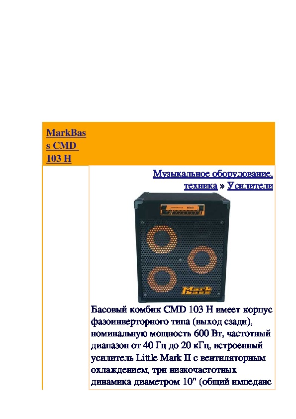 Басовый комбик CMD 103 H имеет корпус фазоинверторного типа (выход сзади), номинальную мощность 600 Вт, частотный диапазон от 40 Гц до 20 кГц, встроенный усилитель Little Mark II с вентиляторным охлаждением, три низкочастотных динамика диаметром 10" (общий импеданс 6 Ом) и высокочастотный компрессионный излучатель диаметром 1", нагруженный на рупор. Частота раздела встроенного кроссовера 3,5 кГц.