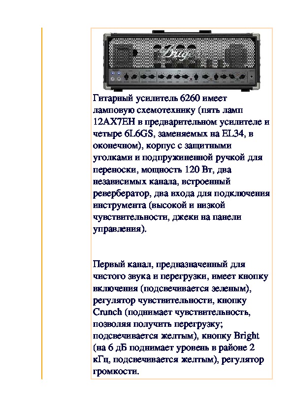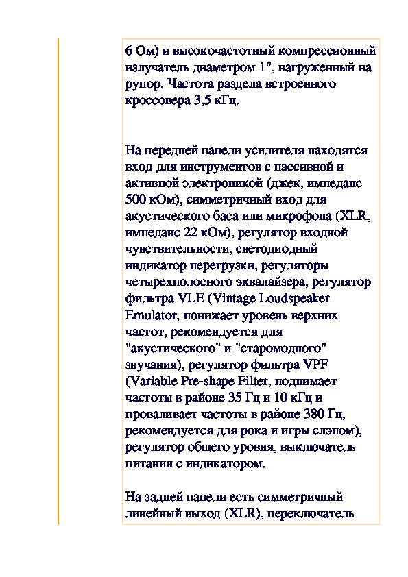 На передней панели усилителя находятся вход для инструментов с пассивной и активной электроникой (джек, импеданс 500 кОм), симметричный вход для акустического баса или микрофона (XLR, импеданс 22 кОм), регулятор входной чувствительности, светодиодный индикатор перегрузки, регуляторы четырехполосного эквалайзера, регулятор фильтра VLE (Vintage Loudspeaker Emulator, понижает уровень верхних частот, рекомендуется для "акустического" и "старомодного" звучания), регулятор фильтра VPF (Variable Pre-shape Filter, поднимает частоты в районе 35 Гц и 10 кГц и проваливает частоты в районе 380 Гц, рекомендуется для рока и игры слэпом), регулятор общего уровня, выключатель питания с индикатором.