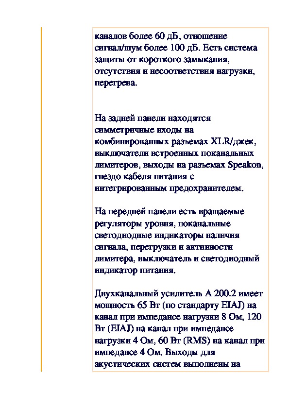 более 200 (1 кГц, 8 Ом), разделениеканалов более 60 дБ, отношение