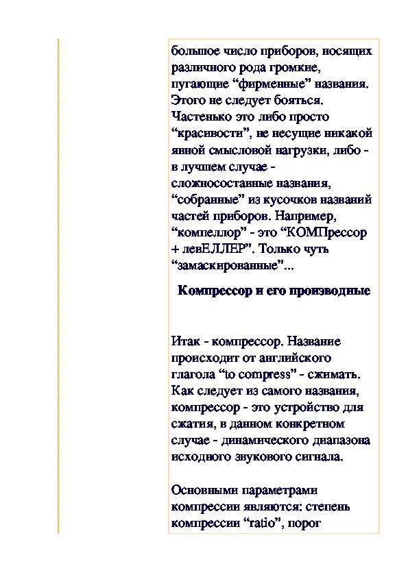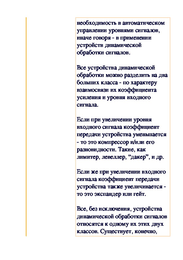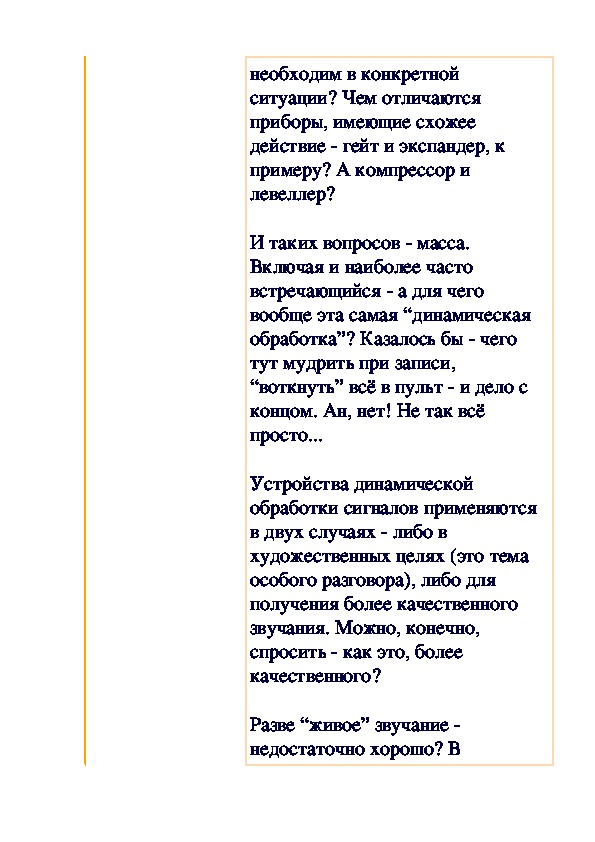 В настоящее время существует огромное множество различных процессоров для динамической обработки звуковых сигналов - это различного рода компрессоры, гейты, экспандеры, левеллеры, лимитеры, и т.д. и т.п. В этом многообразии нетрудно и запутаться - какой прибор необходим в конкретной ситуации? Чем отличаются приборы, имеющие схожее действие - гейт и экспандер, к примеру? А компрессор и левеллер?
