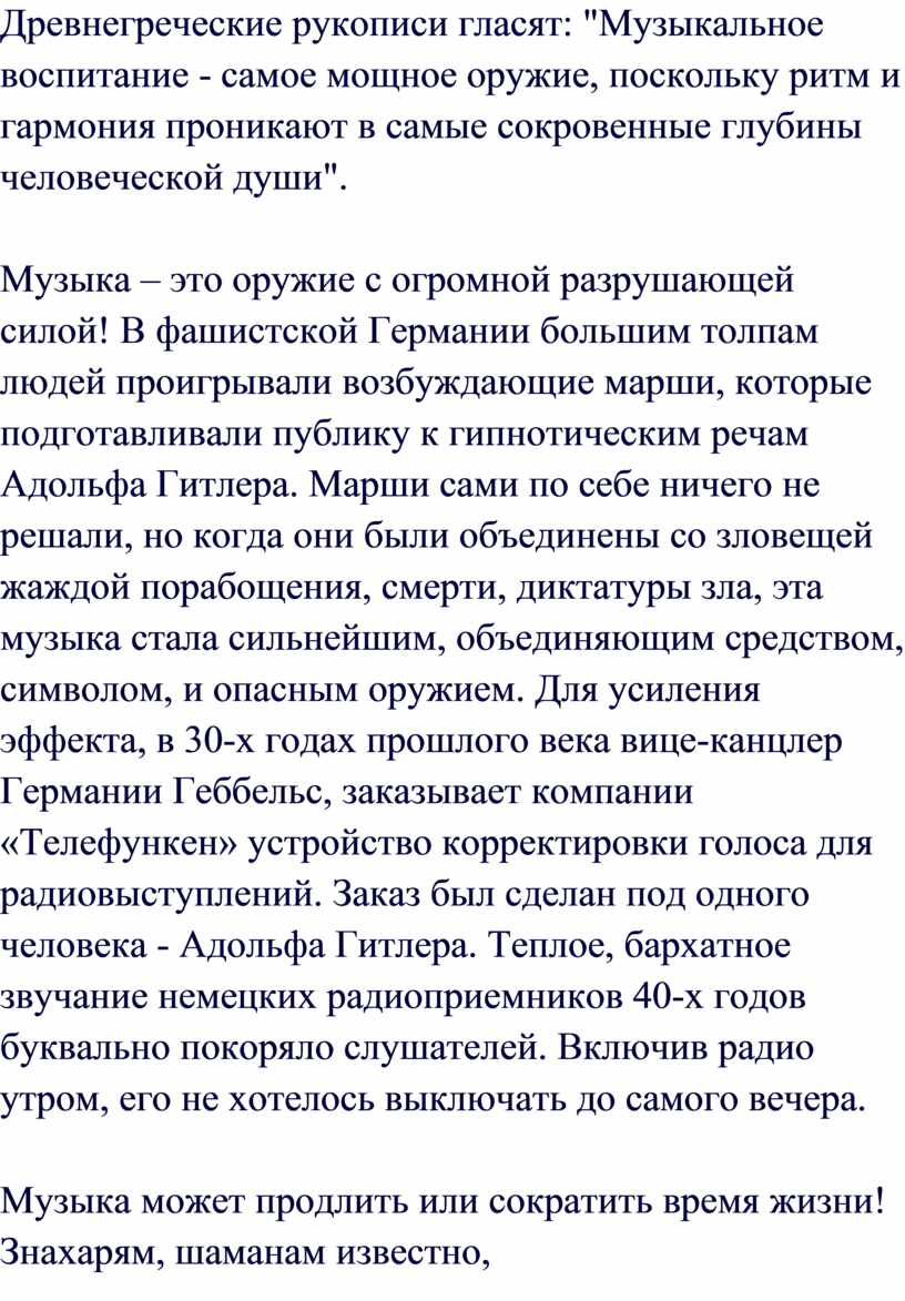 Древнегреческие рукописи гласят: "Музыкальное воспитание - самое мощное
