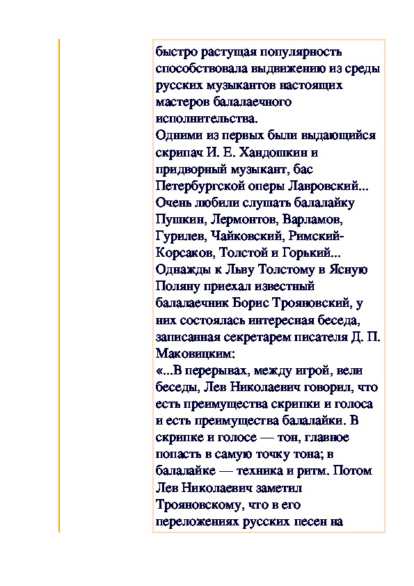 Очень любили слушать балалайку Пушкин, Лермонтов, Варламов, Гурилев, Чайковский, Римский-Корсаков, Толстой и Горький...