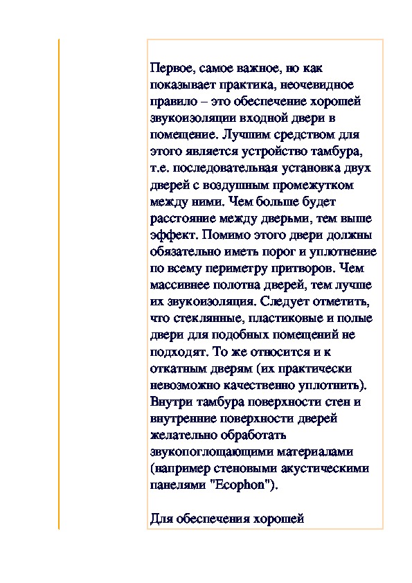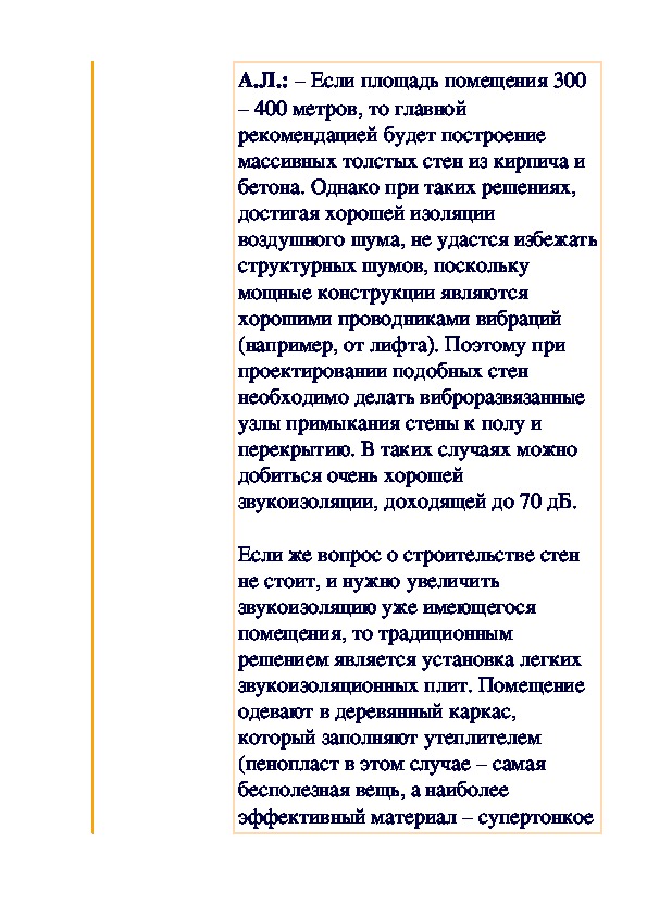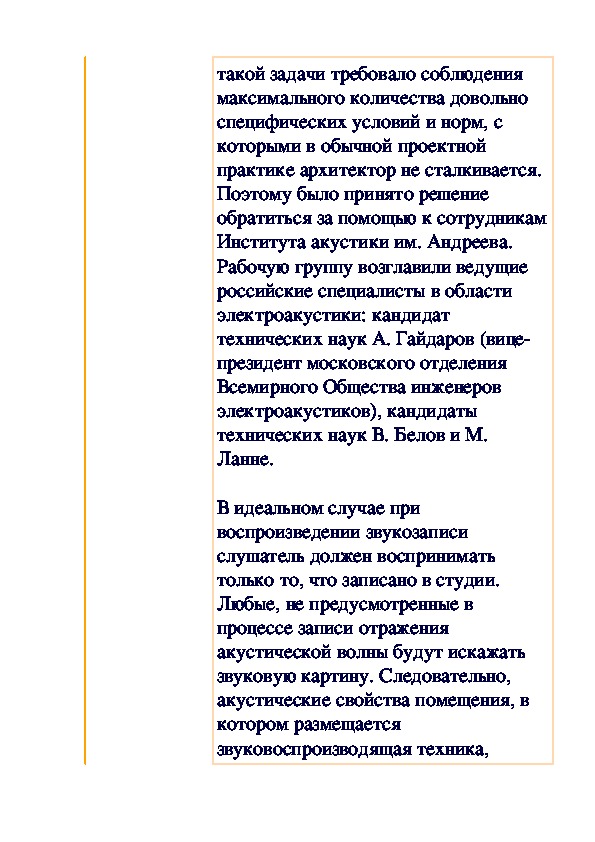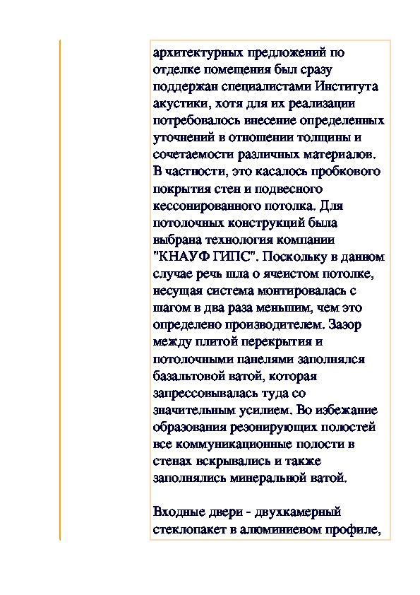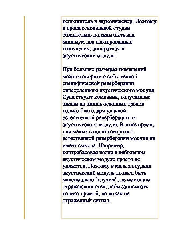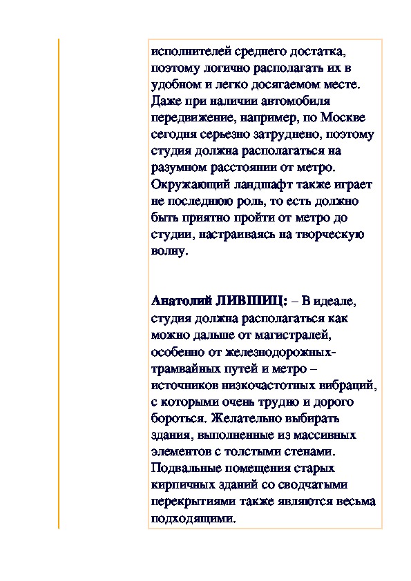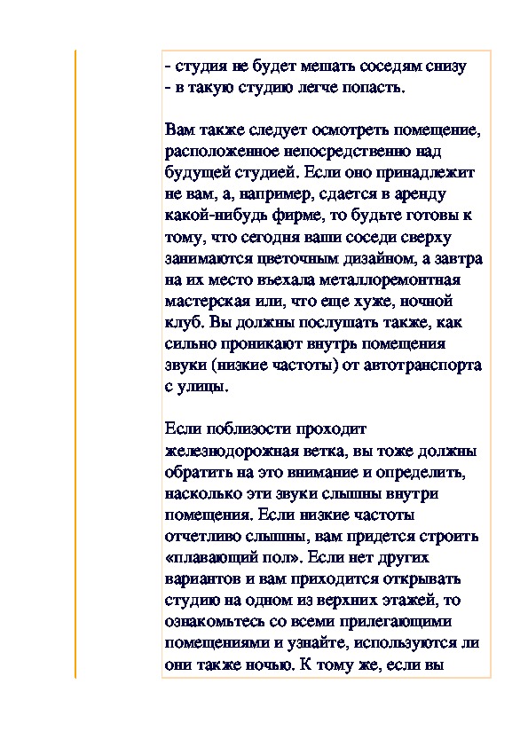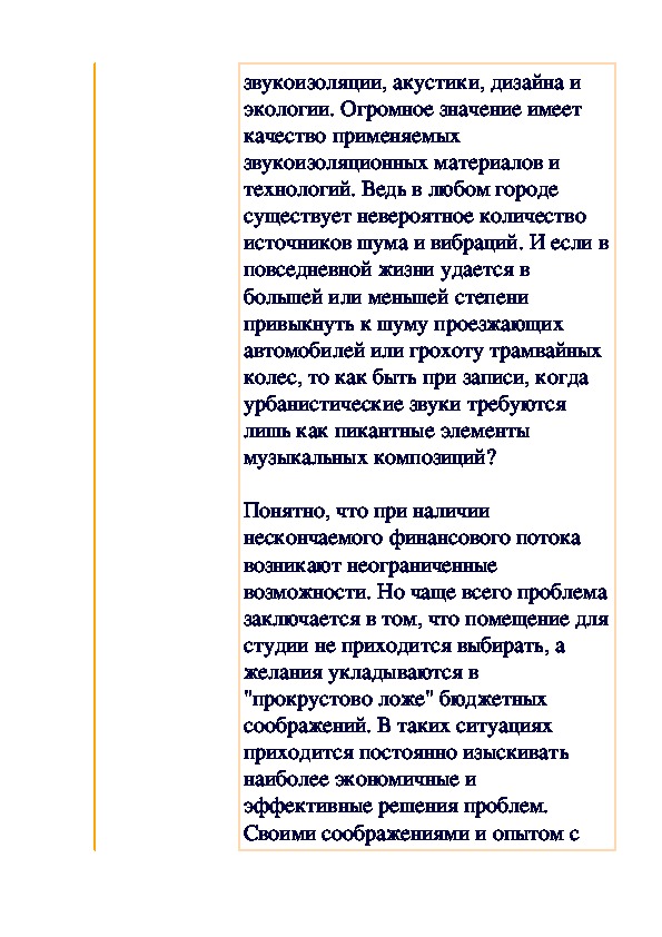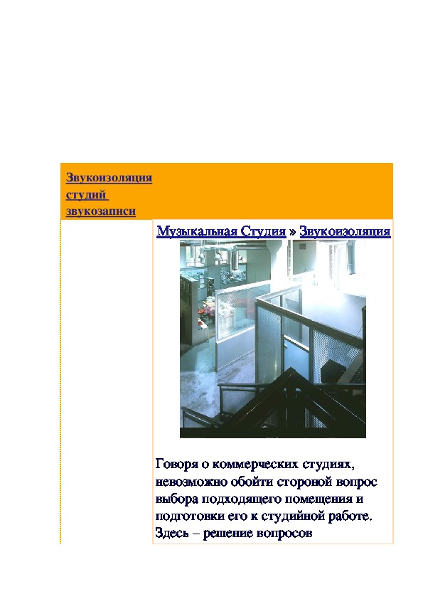 Говоря о коммерческих студиях, невозможно обойти стороной вопрос выбора подходящего помещения и подготовки его к студийной работе. Здесь – решение вопросов звукоизоляции, акустики, дизайна и экологии. Огромное значение имеет качество применяемых звукоизоляционных материалов и технологий. Ведь в любом городе существует невероятное количество источников шума и вибраций. И если в повседневной жизни удается в большей или меньшей степени привыкнуть к шуму проезжающих автомобилей или грохоту трамвайных колес, то как быть при записи, когда урбанистические звуки требуются лишь как пикантные элементы музыкальных композиций?