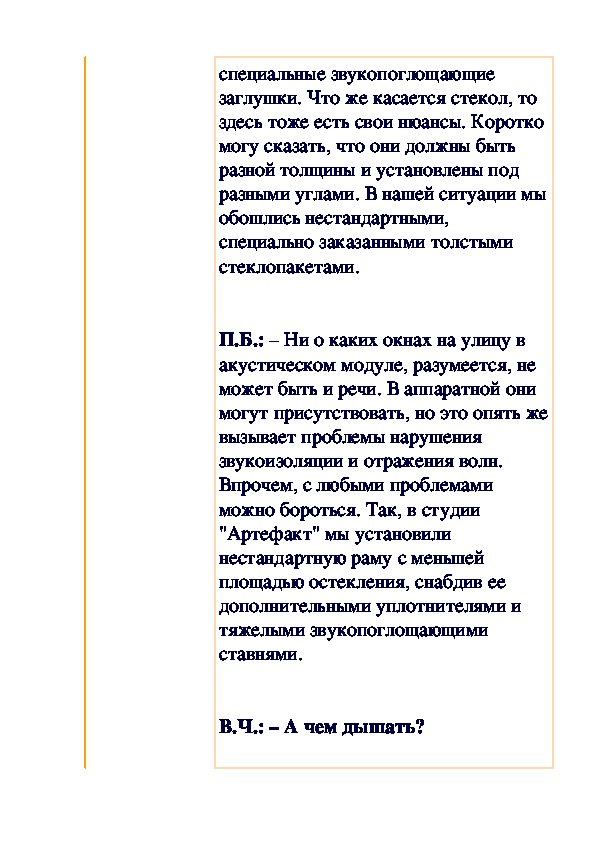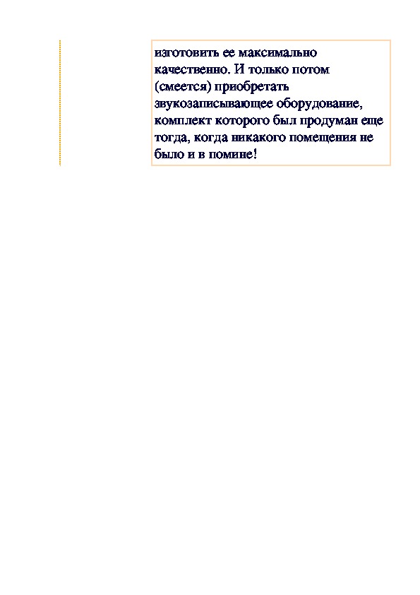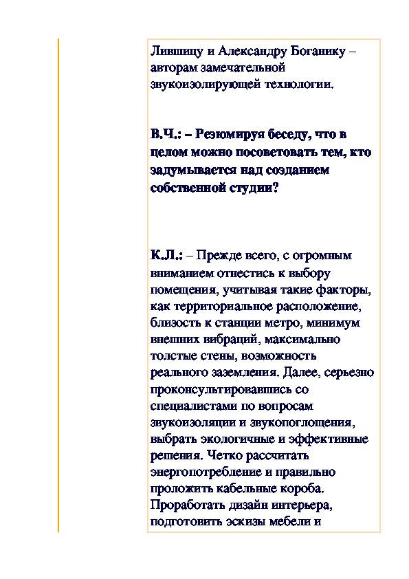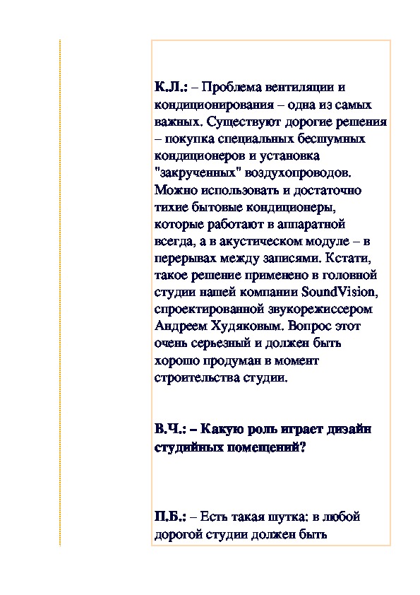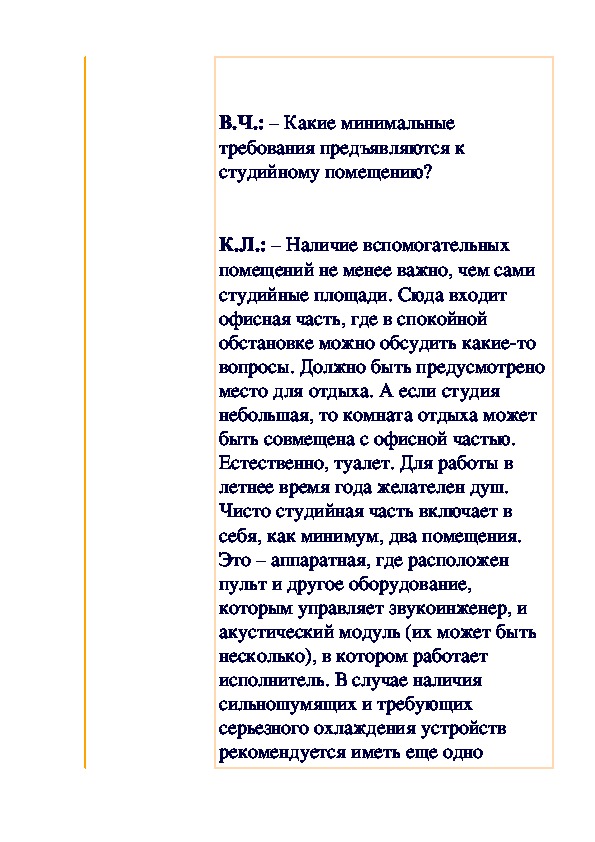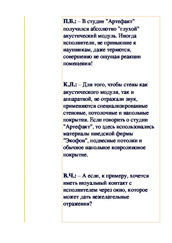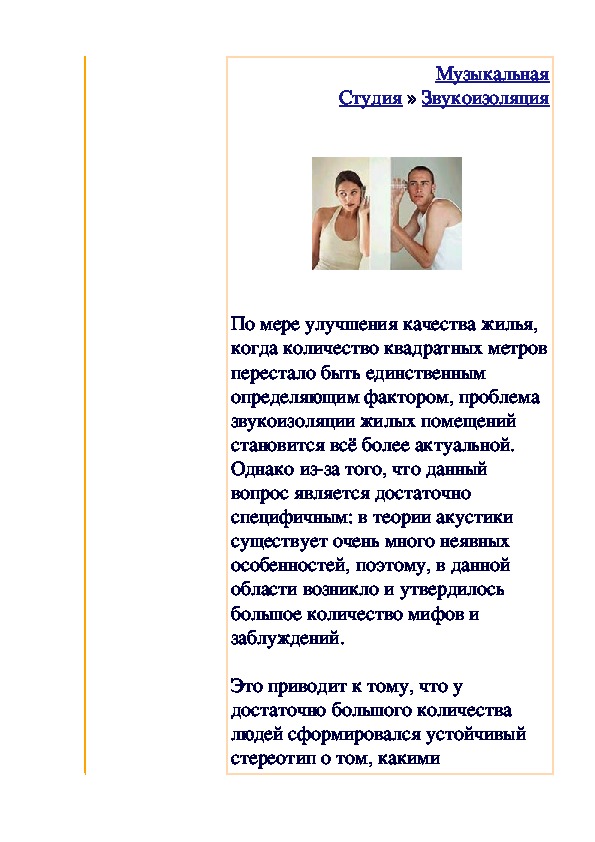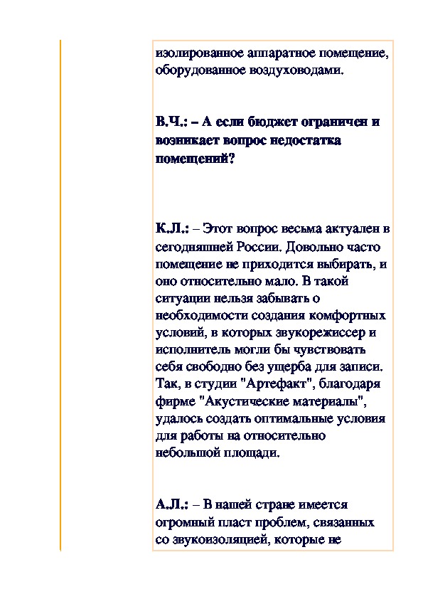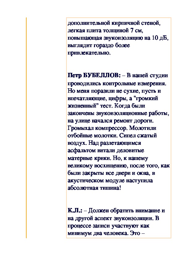 Говоря о коммерческих студиях, невозможно обойти стороной вопрос выбора подходящего помещения и подготовки его к студийной работе. Здесь – решение вопросов звукоизоляции, акустики, дизайна и экологии. Огромное значение имеет качество применяемых звукоизоляционных материалов и технологий. Ведь в любом городе существует невероятное количество источников шума и вибраций. И если в повседневной жизни удается в большей или меньшей степени привыкнуть к шуму проезжающих автомобилей или грохоту трамвайных колес, то как быть при записи, когда урбанистические звуки требуются лишь как пикантные элементы музыкальных композиций?