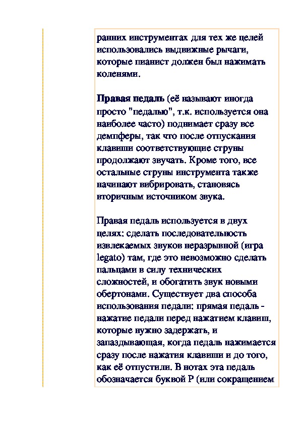 Педали. В современных фортепиано присутствует две или три педали. В более ранних инструментах для тех же целей использовались выдвижные рычаги, которые пианист должен был нажимать коленями.
