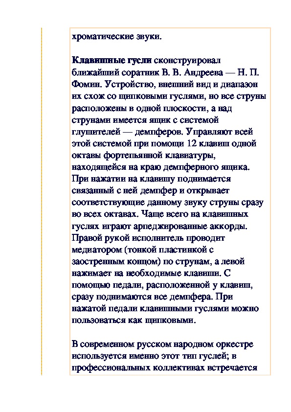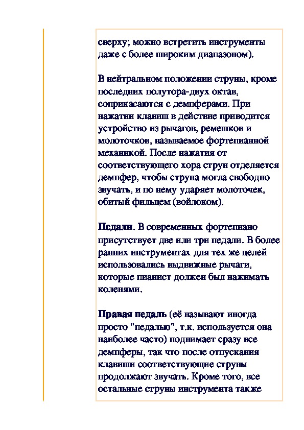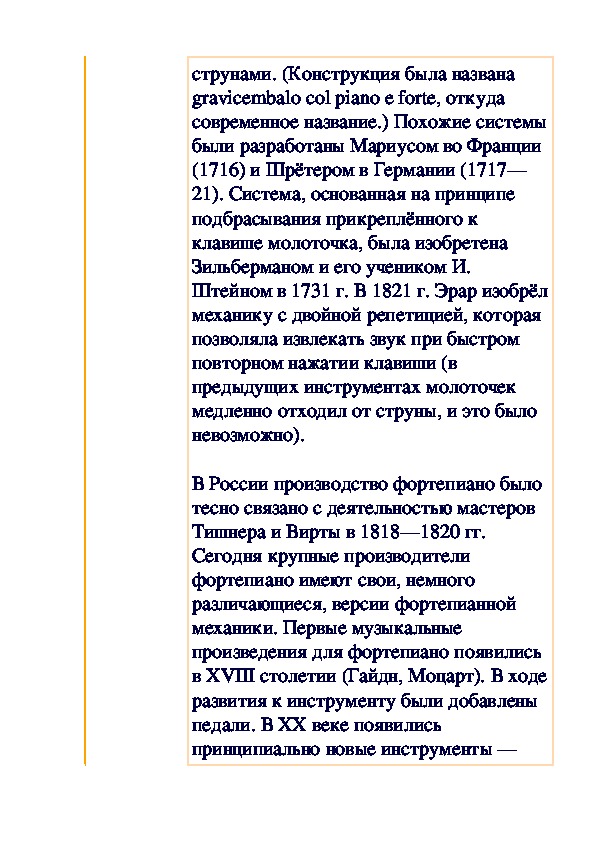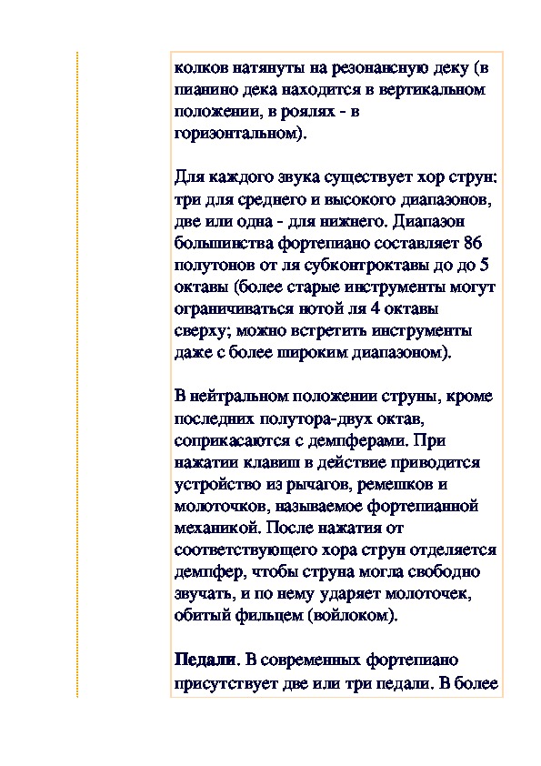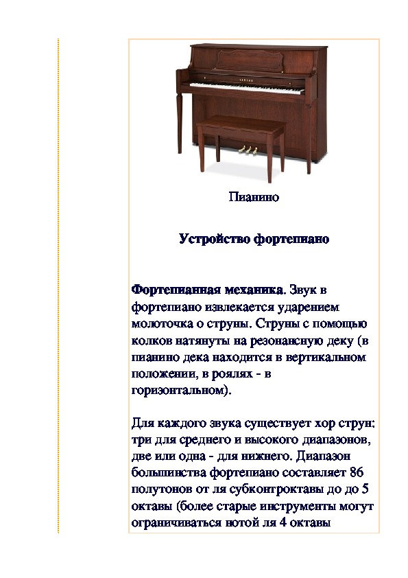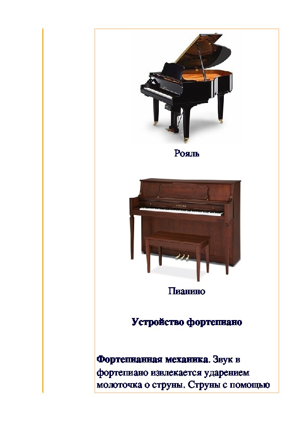 Фортепианная механика. Звук в фортепиано извлекается ударением молоточка о струны. Струны с помощью колков натянуты на резонансную деку (в пианино дека находится в вертикальном положении, в роялях - в горизонтальном).