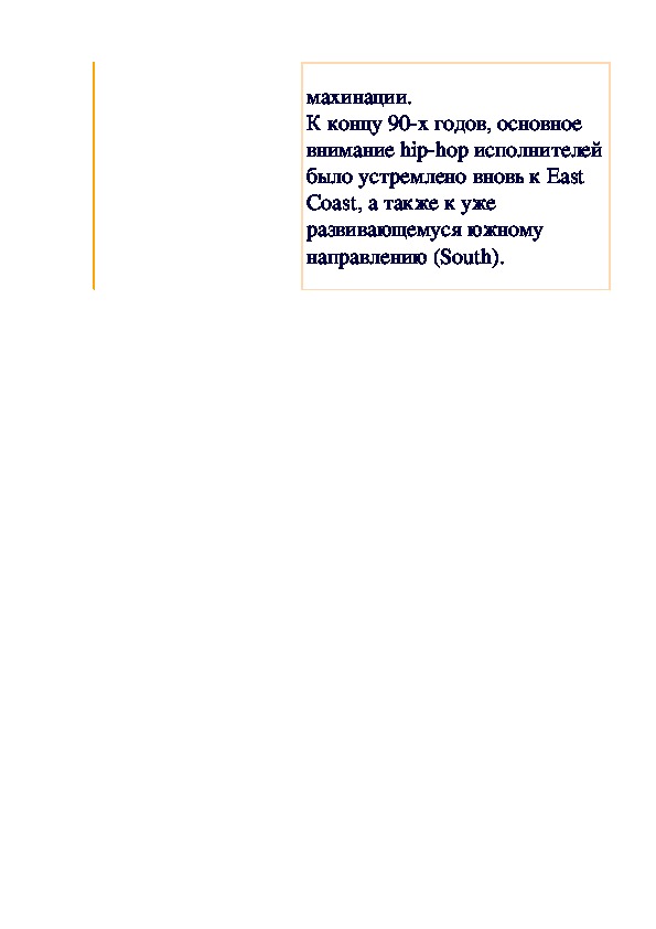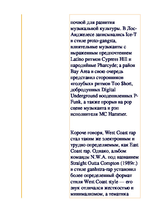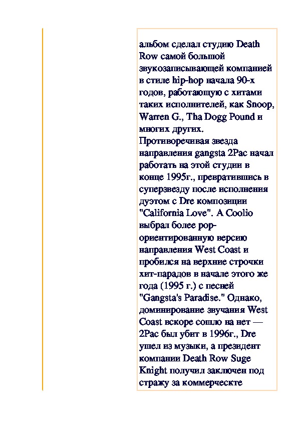 West Coast Rap доминировал на hip-hop сцене в середине 90-х годов, создавая популярность появившемуся направлению gangsta rap и продолжая статус Dr. Dre, как одной из самых влиятельных фигур с rap истории. Хотя, даже если запатентованный Dre стиль G-funk во многом определял звук и стилевую направленность на западном побережье (West Coast), то калифорнийская rap сцена была гораздо разнообразнее.