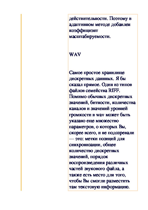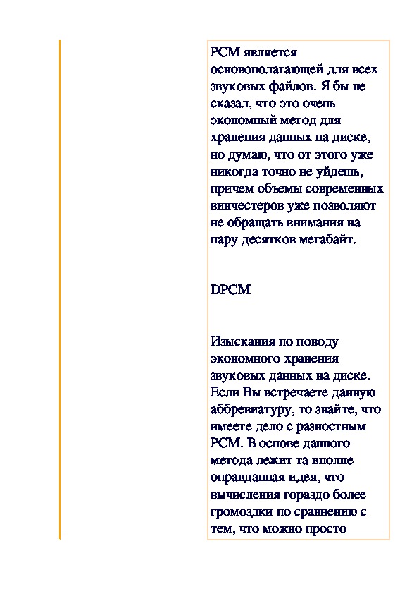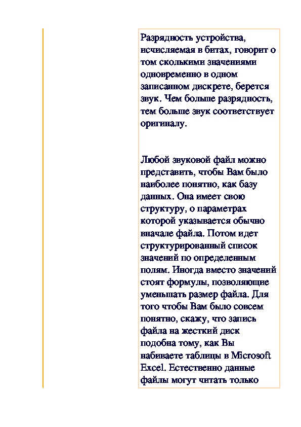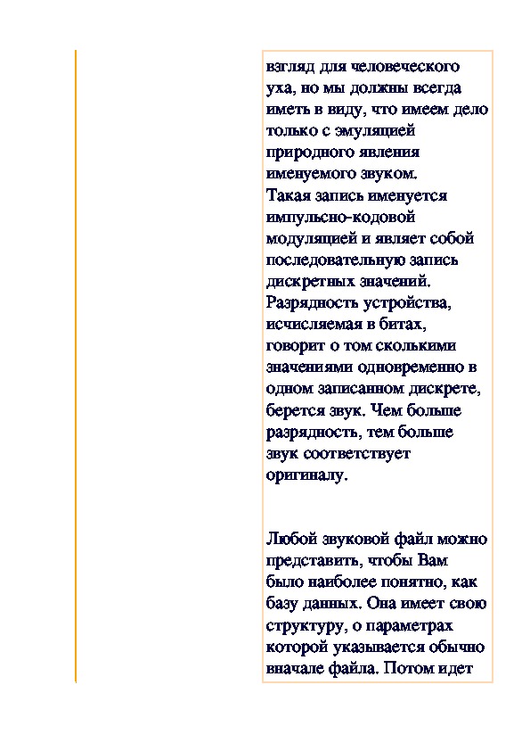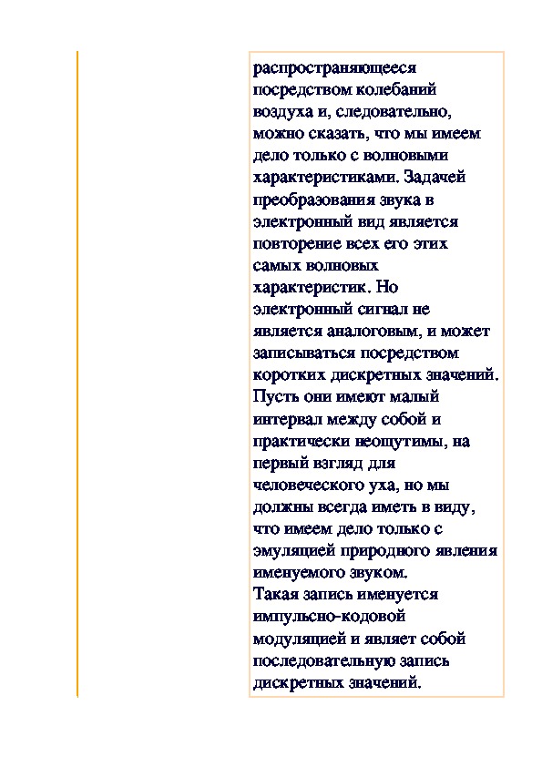Звук — это физическое природное явление, распространяющееся посредством колебаний воздуха и, следовательно, можно сказать, что мы имеем дело только с волновыми характеристиками. Задачей преобразования звука в электронный вид является повторение всех его этих самых волновых характеристик. Но электронный сигнал не является аналоговым, и может записываться посредством коротких дискретных значений. Пусть они имеют малый интервал между собой и практически неощутимы, на первый взгляд для человеческого уха, но мы должны всегда иметь в виду, что имеем дело только с эмуляцией природного явления именуемого звуком.