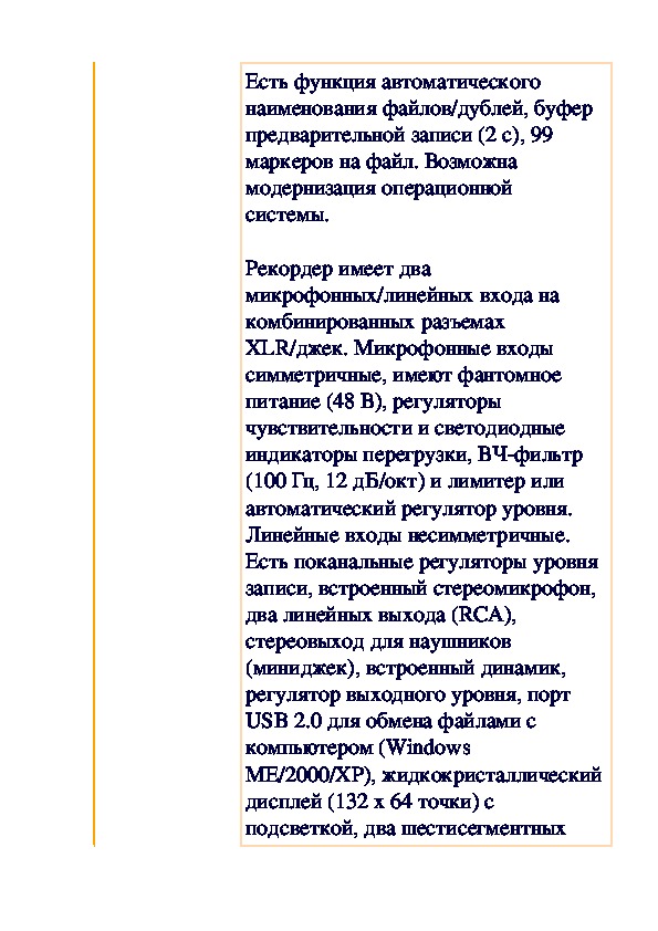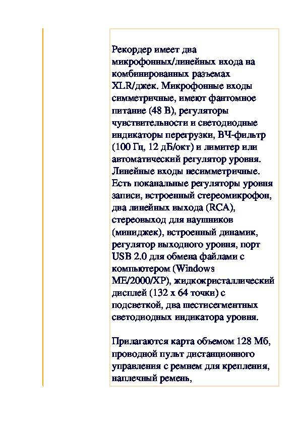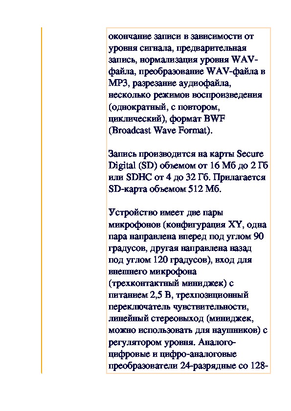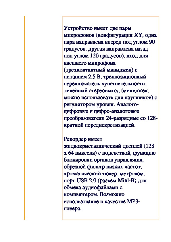 Устройство имеет две пары микрофонов (конфигурация XY, одна пара направлена вперед под углом 90 градусов, другая направлена назад под углом 120 градусов), вход для внешнего микрофона (трехконтактный миниджек) с питанием 2,5 В, трехпозиционный переключатель чувствительности, линейный стереовыход (миниджек, можно использовать для наушников) с регулятором уровня. Аналого-цифровые и цифро-аналоговые преобразователи 24-разрядные со 128-кратной передискретизацией.