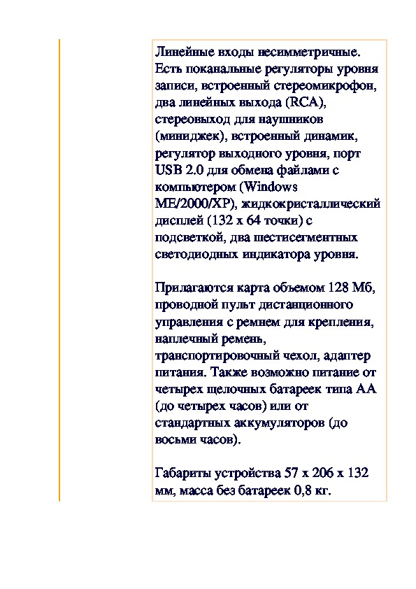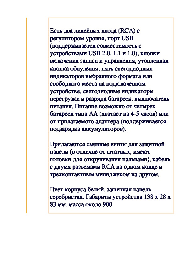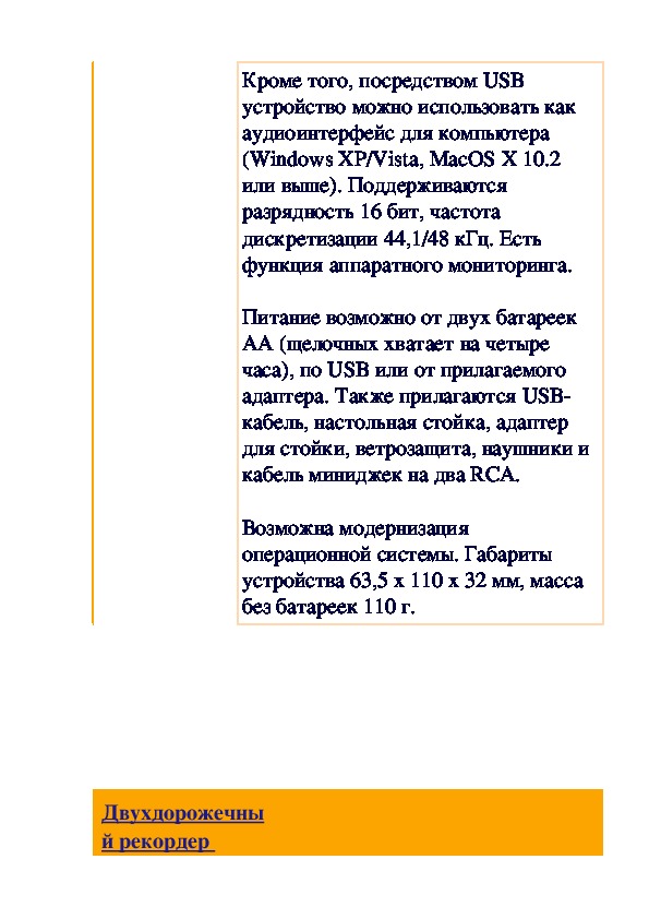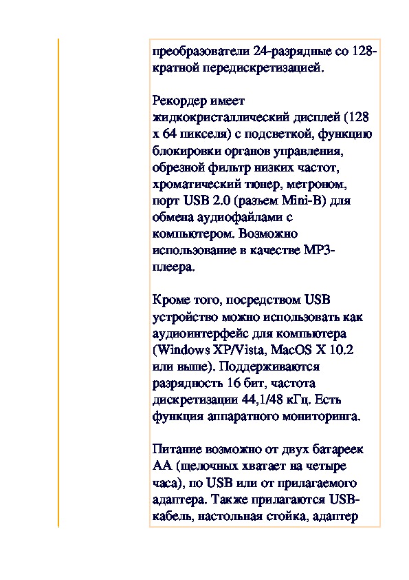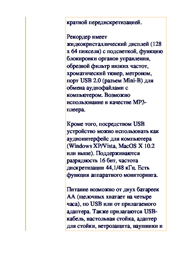 Питание возможно от двух батареек AA (щелочных хватает на четыре часа), по USB или от прилагаемого адаптера. Также прилагаются USB-кабель, настольная стойка, адаптер для стойки, ветрозащита, наушники и кабель миниджек на два RCA.