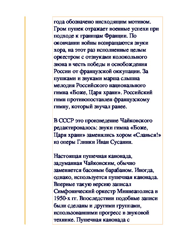 Увертюра начинается с мрачных звуков русского церковного хора, напоминая об объявлении войны, которое осуществлялось в России на церковных службах. Затем, сразу же, звучит праздничное пение о победе русского оружия в войне. Объявление войны и реакция народа на него была описана в романе Льва Толстого «Война и мир».