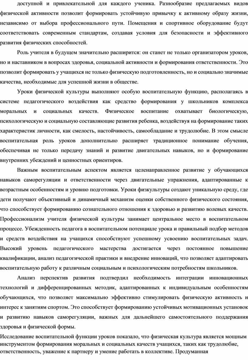 Анализ перспектив развития подтвердил необходимость интеграции инновационных технологий и дифференцированных методик, адаптированных к индивидуальным особенностям обучающихся, что позволяет максимально эффективно стимулировать физическую активность и интерес к занятиям спортом. Это способствует формированию устойчивых мотивационных установок и развитию навыков саморегуляции, важных для дальнейшего самостоятельного поддержания здоровья и физической формы.
