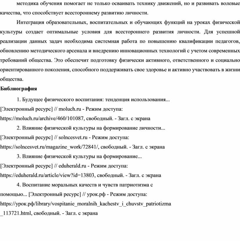 Библиография1. Будущее физического воспитания: тенденция использования... [Электронный ресурс] // moluch.ru - Режим доступа: https://moluch.ru/archive/460/101087, свободный. - Загл. с экрана 2. Влияние физической культуры на формирование личности... [Электронный ресурс] // solncesvet.ru - Режим доступа: https://solncesvet.ru/magazine_work/72841/, свободный. - Загл. с экрана 3. Влияние физической культуры на формирование... [Электронный ресурс] // eduherald.ru - Режим доступа: https://eduherald.ru/article/view?id=13803, свободный. - Загл. с экрана 4. Воспитание моральных качеств и чувств патриотизма с помощью... [Электронный ресурс] // урок.рф - Режим доступа: https://урок.рф/library/vospitanie_moralnih_kachestv_i_chuvstv_patriotizma_113721.html, свободный. - Загл. с экрана