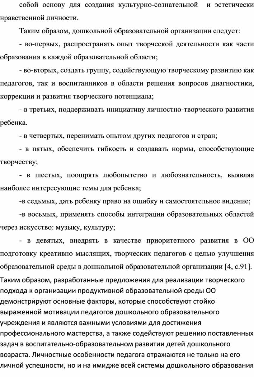 Таким образом, разработанные предложения для реализации творческого подхода к организации продуктивной образовательной среды ОО демонстрируют основные факторы, которые способствуют стойко выраженной мотивации педагогов дошкольного образовательного учреждения и являются важными условиями для достижения профессионального мастерства, а также содействуют решению поставленных задач в воспитательно-образовательном развитии детей дошкольного возраста. Личностные особенности педагога отражаются не только на его личной успешности, но и на имидже всей системы дошкольного образования и, что наиболее важно, на формировании личности школьника, что является основной ценностью и национальным приоритетом нашей страны.
