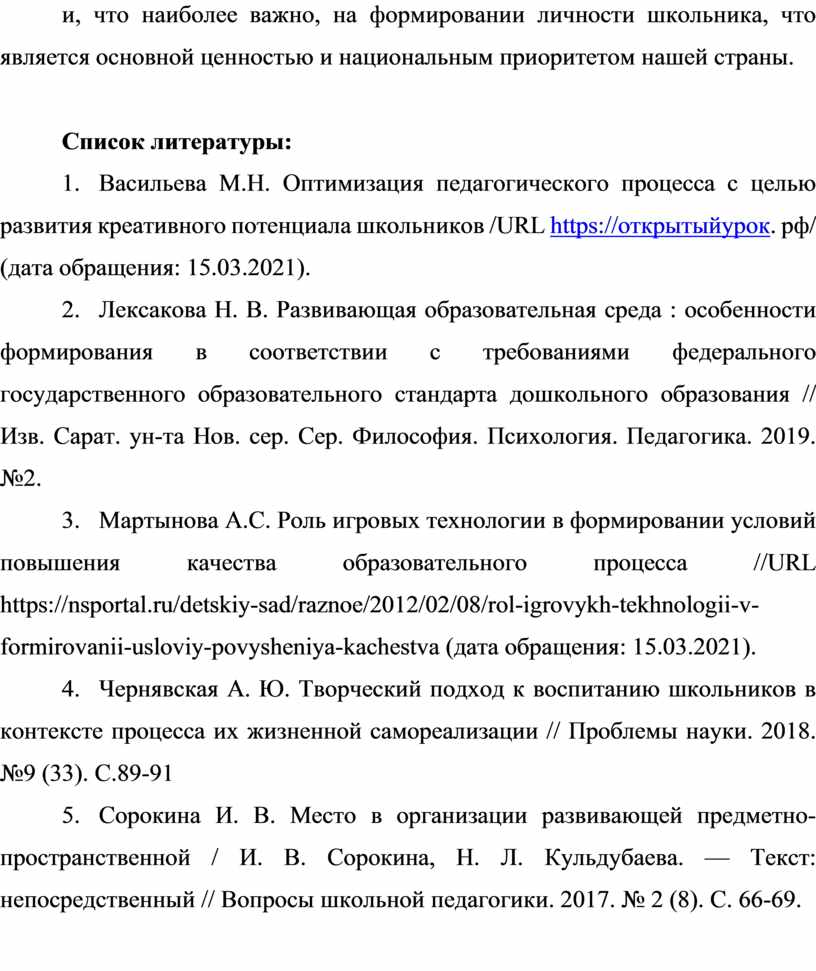 1. Васильева М.Н. Оптимизация педагогического процесса с целью развития креативного потенциала школьников /URL https://открытыйурок. рф/ (дата обращения: 15.03.2021).