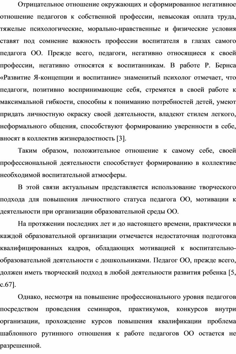 Отрицательное отношение окружающих и сформированное негативное отношение педагогов к собственной профессии, невысокая оплата труда, тяжелые психологические, морально-нравственные и физические условия ставят под сомнение важность профессии воспитателя в глазах самого педагога ОО. Прежде всего, педагоги, негативно относящиеся к своей профессии, негативно относятся к воспитанникам. В работе Р. Бернса «Развитие Я-концепции и воспитание» знаменитый психолог отмечает, что педагоги, позитивно воспринимающие себя, стремятся в своей работе к максимальной гибкости, способны к пониманию потребностей детей, умеют придать личностную окраску своей деятельности, владеют стилем легкого, неформального общения, способствуют формированию уверенности в себе, вносят в коллектив жизнерадостность [3].