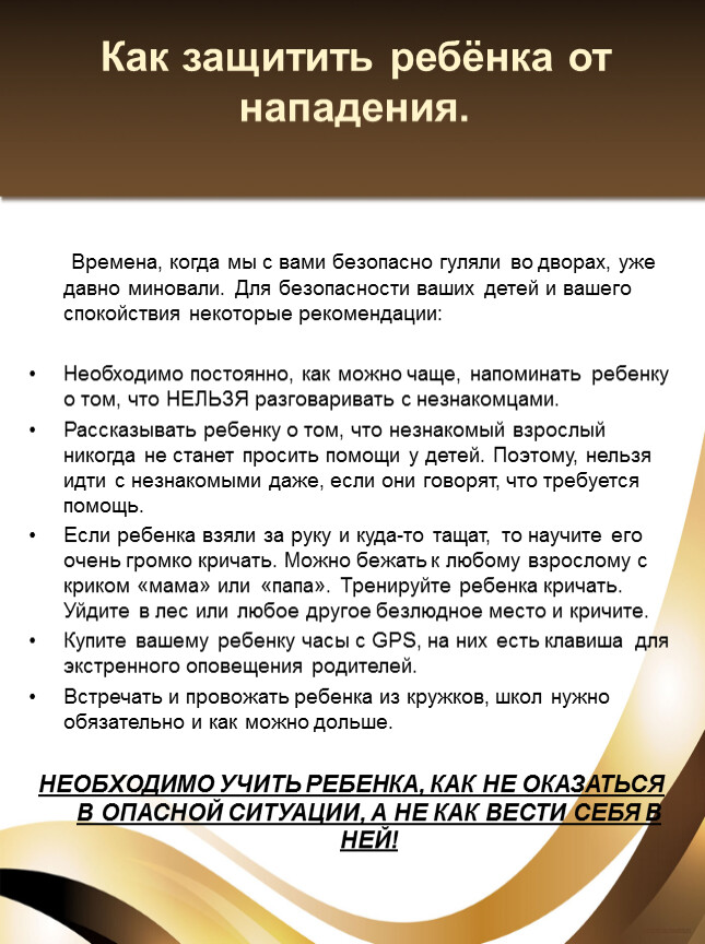 Времена, когда мы с вами безопасно гуляли во дворах, уже давно миновали. Для безопасности ваших детей и вашего спокойствия некоторые рекомендации: