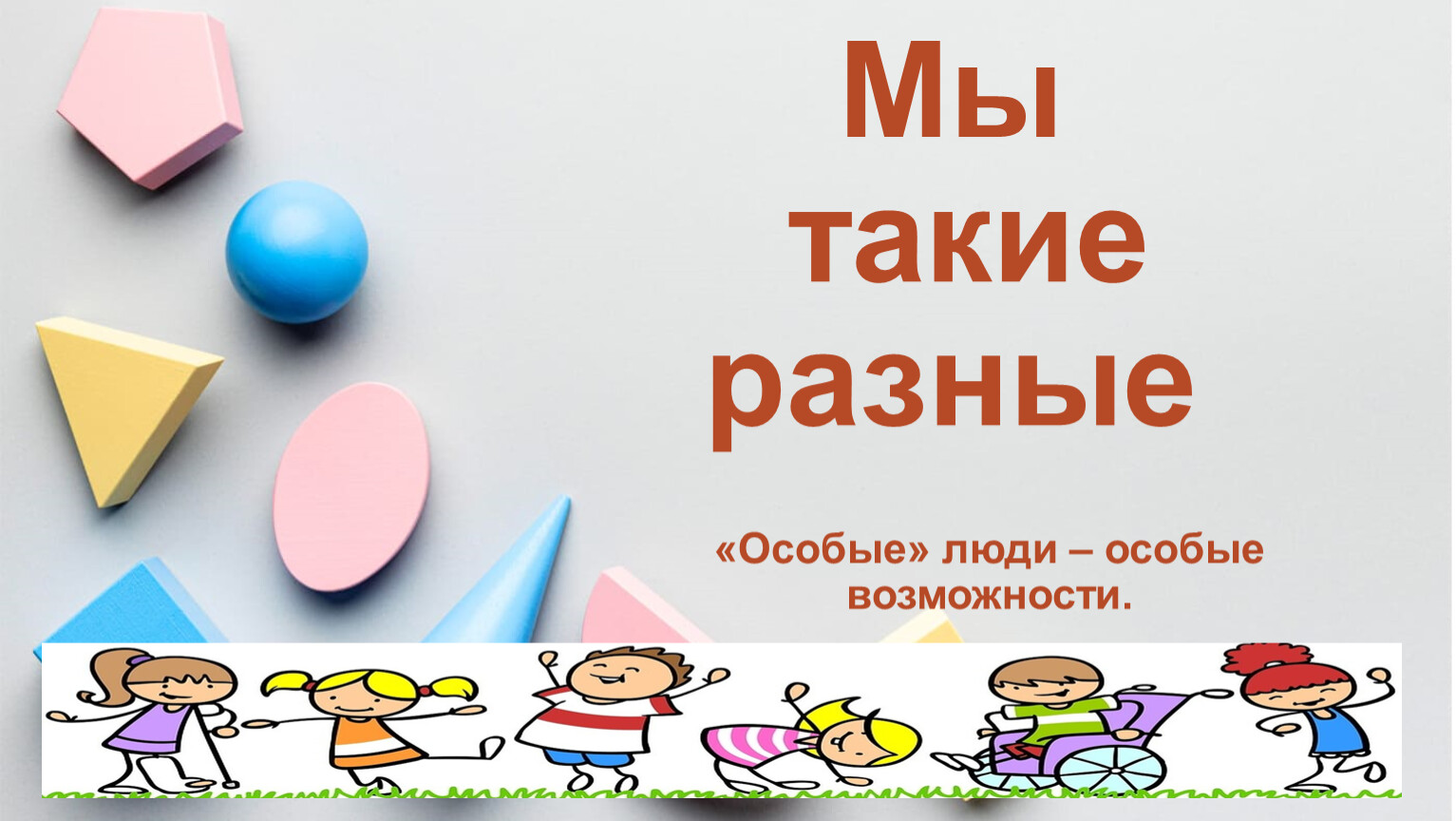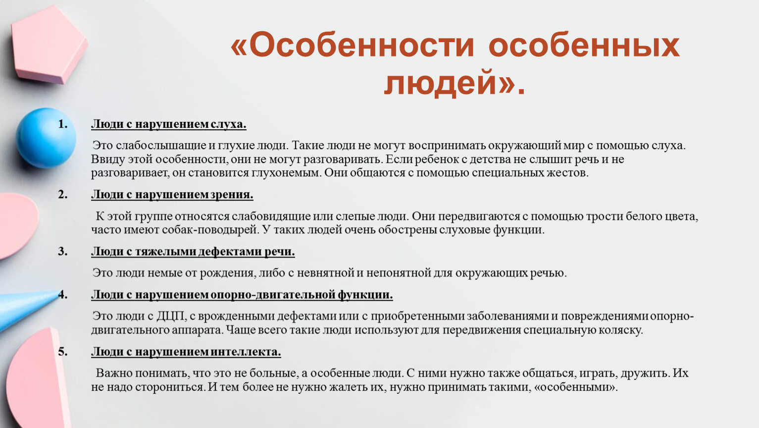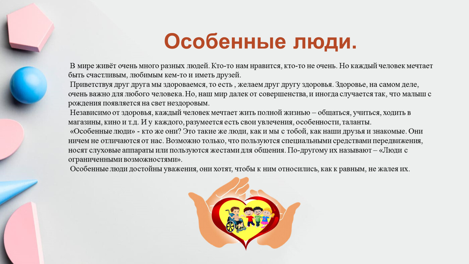 «Особенные люди» - кто же они? Это такие же люди, как и мы с тобой, как наши друзья и знакомые. Они ничем не отличаются от нас. Возможно только, что пользуются специальными средствами передвижения, носят слуховые аппараты или пользуются жестами для общения. По-другому их называют – «Люди с ограниченными возможностями».