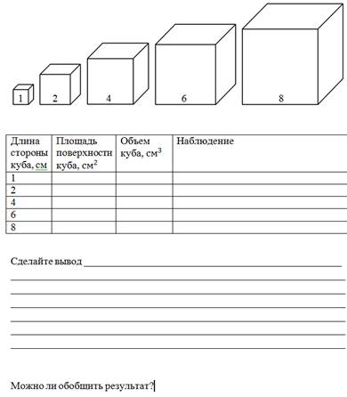 Задание рассчитано на парную или групповую работу. Необходимо заполнить таблицу значениями площади поверхности и объема кубов (акцент на знание и применение). Затем, проанализировав результаты, сделать вывод, как изменяется площадь и объем куба при изменении длины стороны (акцент на мыслительные навыки высокого уровня, а именно анализ, синтез и интерпретация):