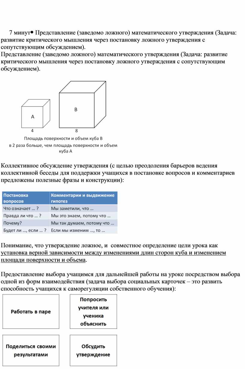 Понимание, что утверждение ложное, и совместное определение цели урока как установка верной зависимости между изменениями длин сторон куба и изменением площади поверхности и объема.