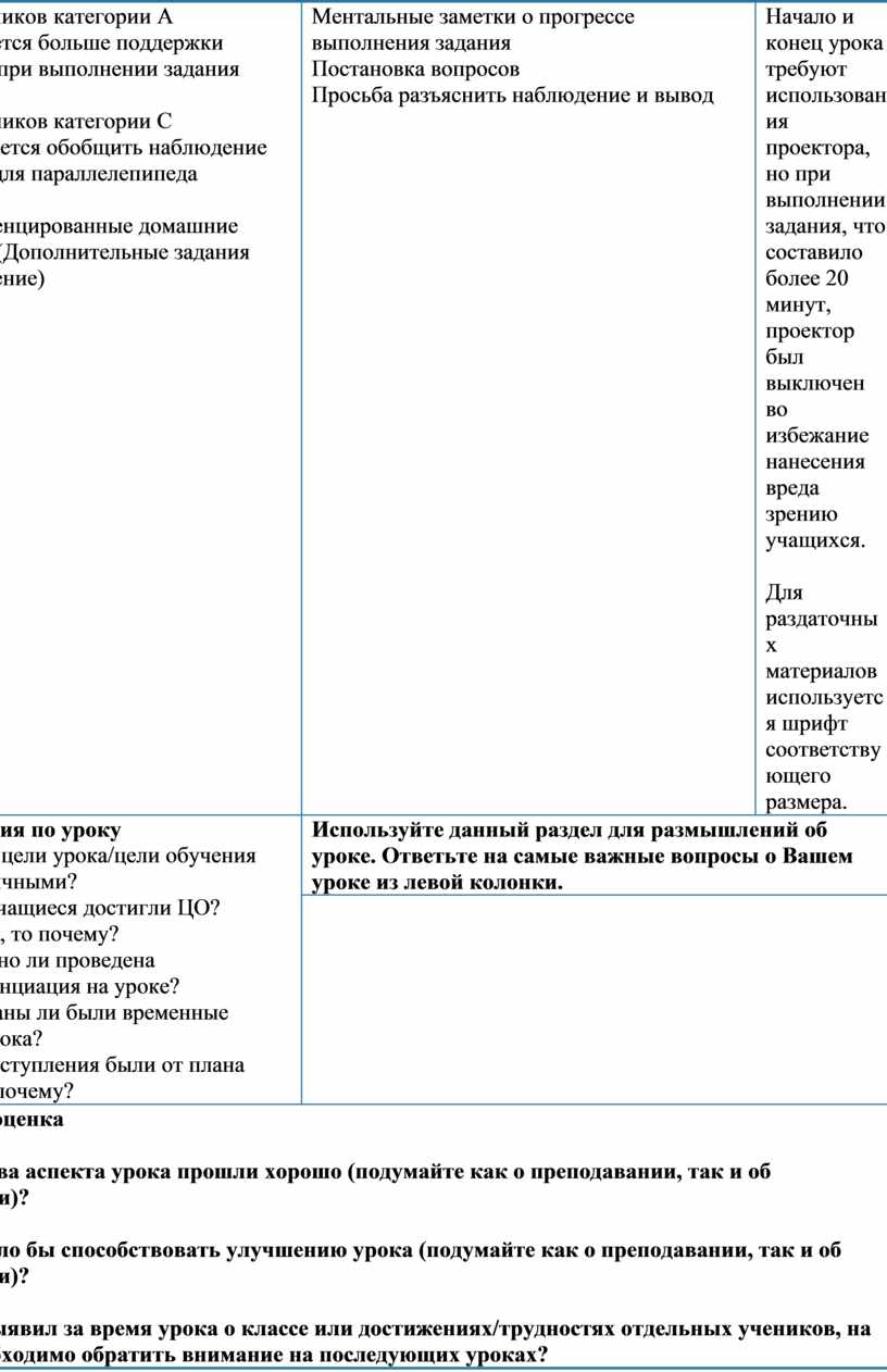 Используйте данный раздел для размышлений об уроке. Ответьте на самые важные вопросы о Вашем уроке из левой колонки. |