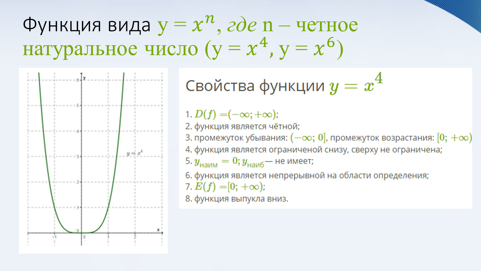 Функция вида y = 𝑥 𝑛 𝑥𝑥 𝑥 𝑛 𝑛𝑛 𝑥 𝑛 , где n – четное натуральное число (y = 𝑥 4 𝑥𝑥 𝑥 4 4 𝑥 4 , y = 𝑥 6 𝑥𝑥 𝑥 6 6 𝑥 6 )
