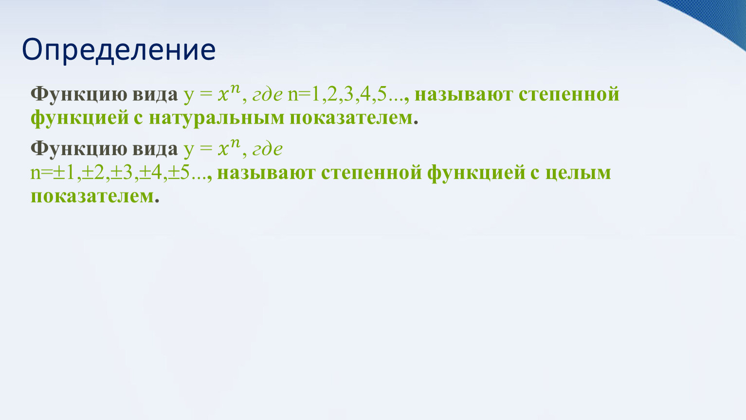 Функцию вида y = 𝑥 𝑛 𝑥𝑥 𝑥 𝑛 𝑛𝑛 𝑥 𝑛 , где n=1,2,3,4,5..., называют cтепенной функцией с целым показателем.