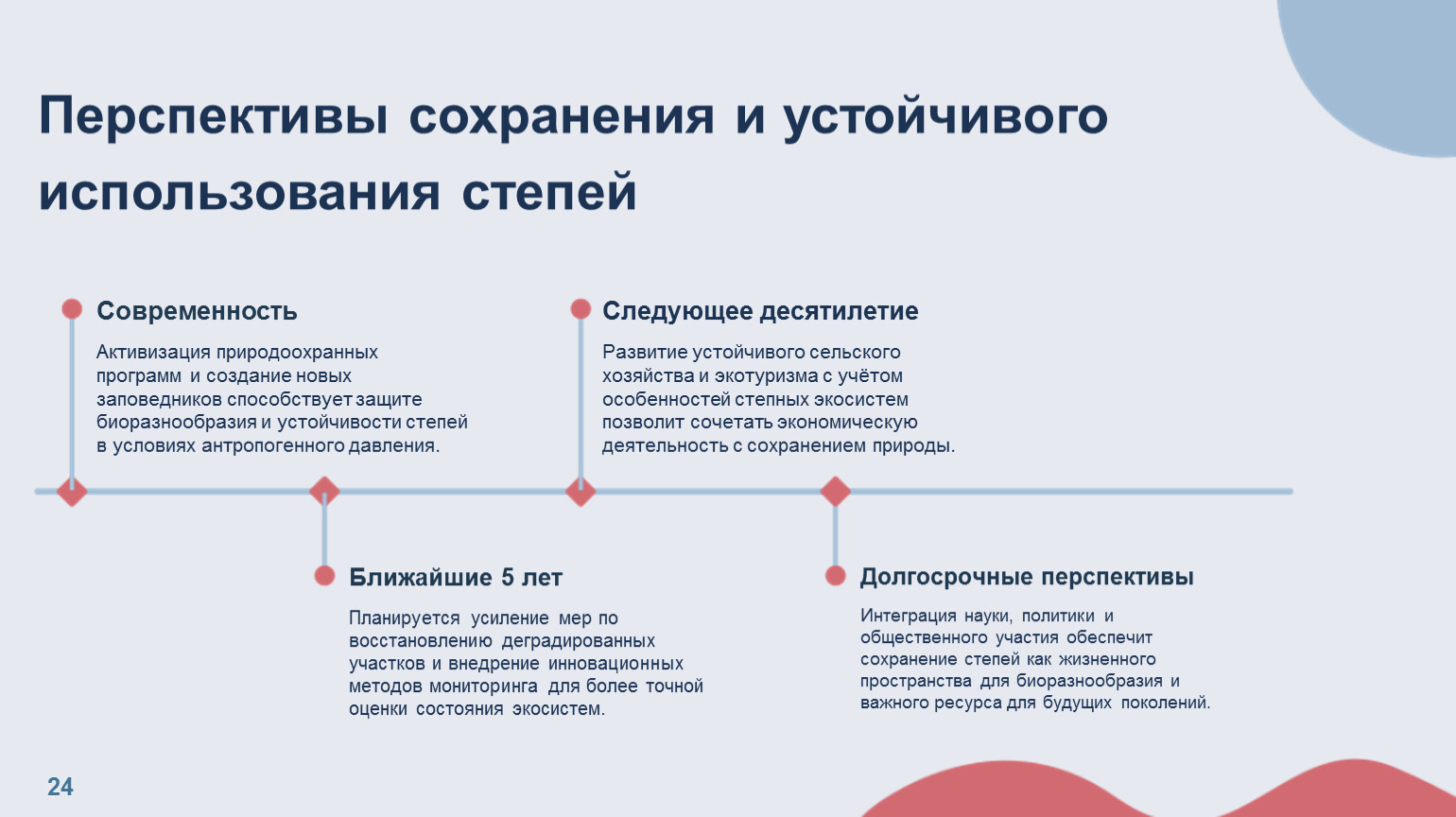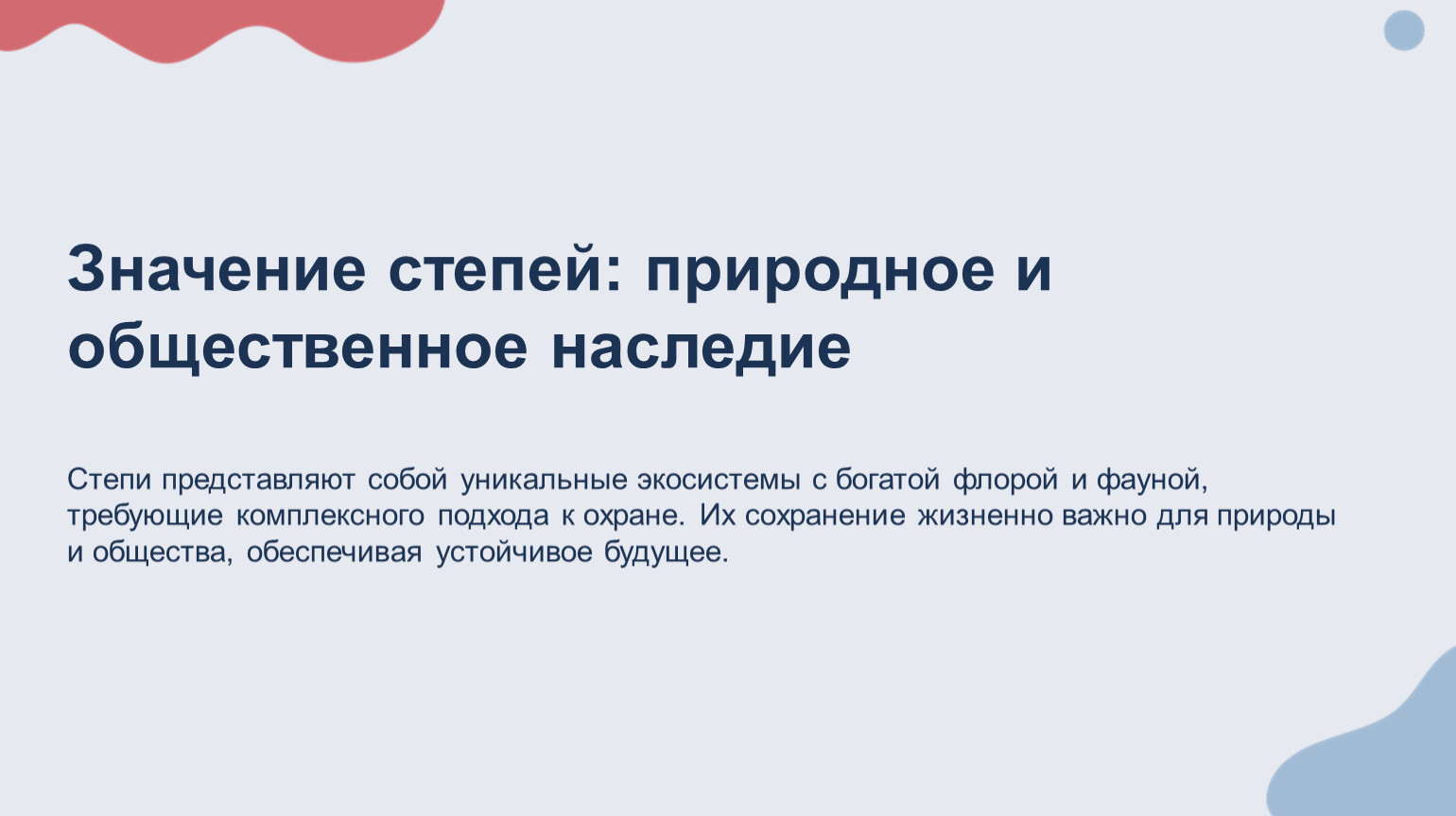 Долгосрочные перспективы Интеграция науки, политики и общественного участия обеспечит сохранение степей как жизненного пространства для биоразнообразия и важного ресурса для будущих поколений.
