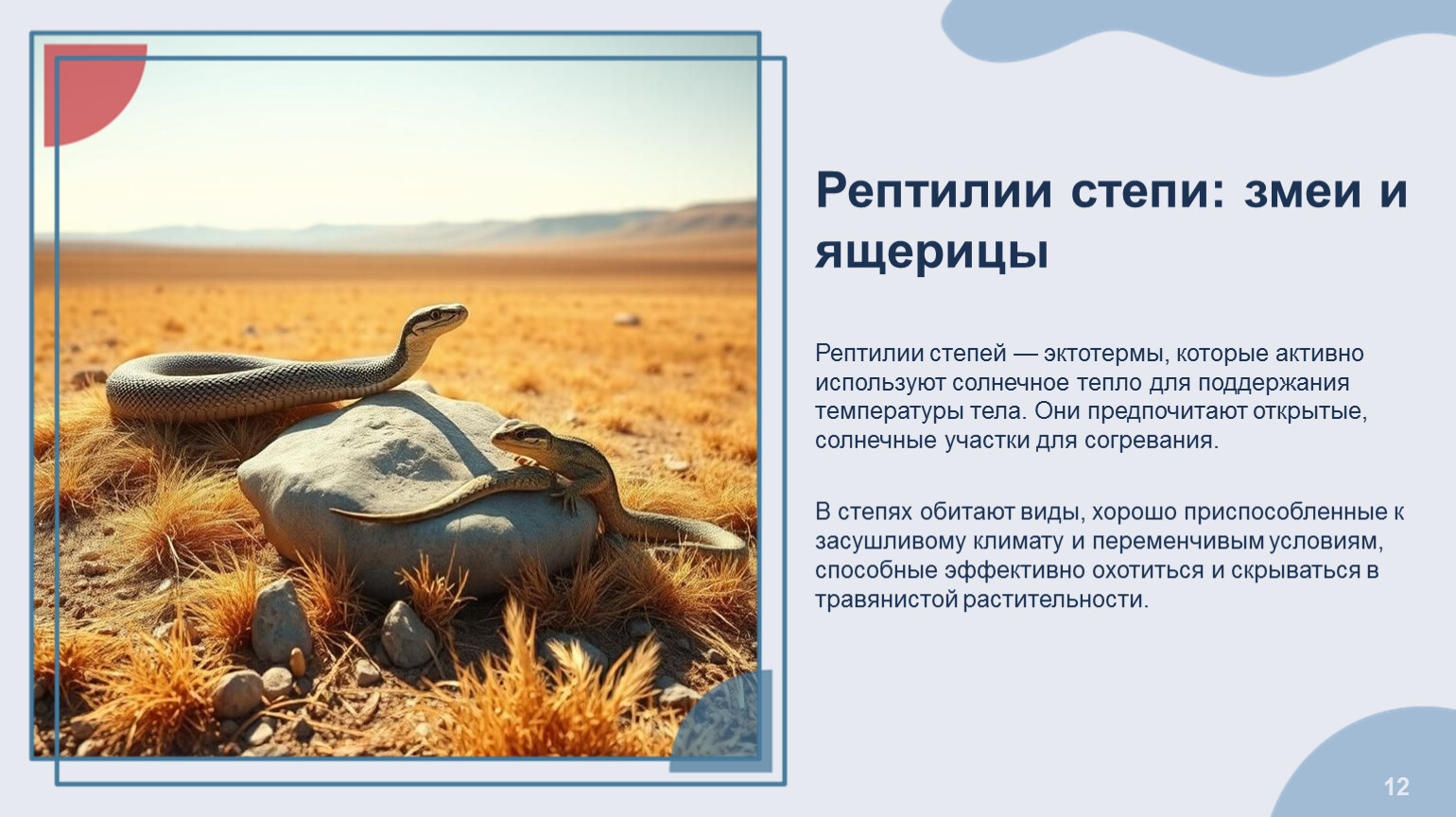 Рептилии степи: змеи и ящерицы Рептилии степей — эктотермы, которые активно используют солнечное тепло для поддержания температуры тела. Они предпочитают открытые, солнечные участки для согревания. В степях обитают виды, хорошо приспособленные к засушливому климату и переменчивым условиям, способные эффективно охотиться и скрываться в травянистой растительности.